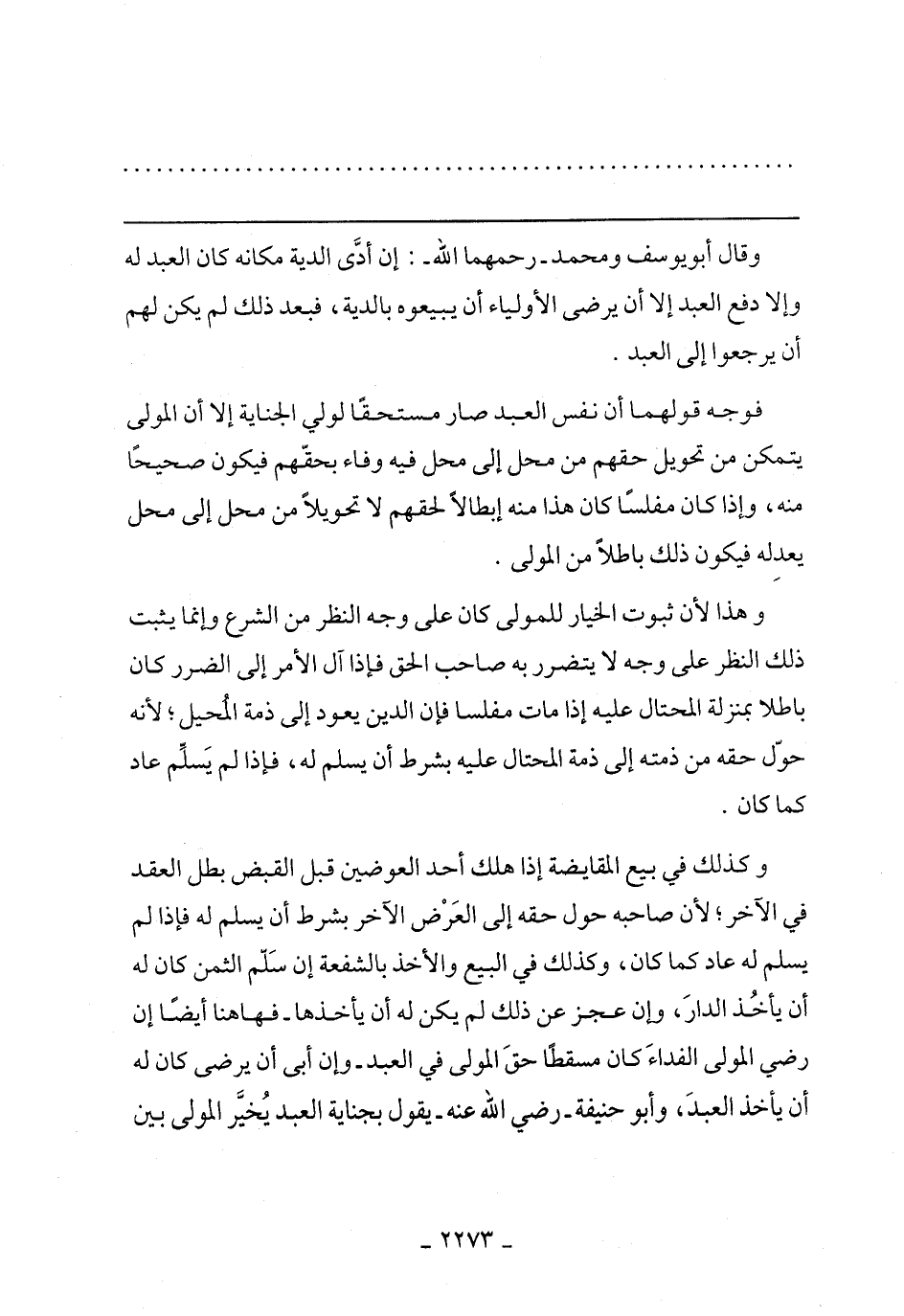 وكذلك في بيع المقايضة إذا هلك أحد العوضين قبل القبض بطل العقد في الآخر؛ لأن صاحبه حول حقه إلى العرض الآخر بشرط أن يسلم له فإذا لم يسلم له عاد كما كان، وكذلك في البيع والأخذ بالشفعة إن سلم الثمن كان له أن يأخذ الدار، وإن عجز عن ذلك لم يكن له أن يأخذها -فهاهنا أيضًا إن رضي المولى الفداء كان مسقطًا حق المولى في العبد- وإن أبي أن يرضى كان له أن يأخذ العبد، وأبو حنيفة رضي الله عنه يقنول بجناية العبد يخير المولى بين