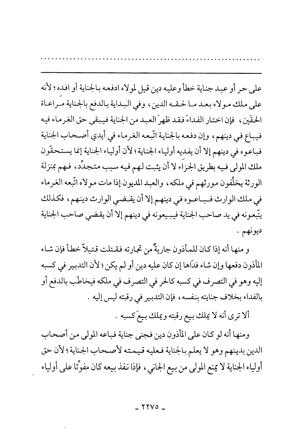 على حر أو عبد جناية خطأ وعليه دين قيل لمولاه ادفعه بالجناية أو افده؛ لأنه على ملك مولاه بعد ما لحقه الدين، وفي البداية بالدفع بالجناية مراعاة الحقين، فإن اختار الفداء فقد ظهر العبد من الجناية فيبقى حق الغرماء فيه فيباع في دينهم، وإن دفعه بالجناية اتبعه الغرماء في أيدي أصحاب الجناية فباعوه في دينهم إلا أن يفديه أولياء الجناية؛ لأن أولياء الجناية إنما يستحقون ملك المولى فيه بطريق الجزاء لا أن يثبت لهم فيه سبب متجدد، فهم بمنزلة الورثة يخلفون مورثهم في ملكه، والعبد المديون إذا مات مولاه اتبعه الغرماء في ملك الوارث فباعوه في دينهم إلا أن يقضى الوارث دينهم، فكذلك يتبعونه في يد صاحب الجناية فيبيعونه في دينهم إلاأن يقضي صاحب الجناية ديونهم.