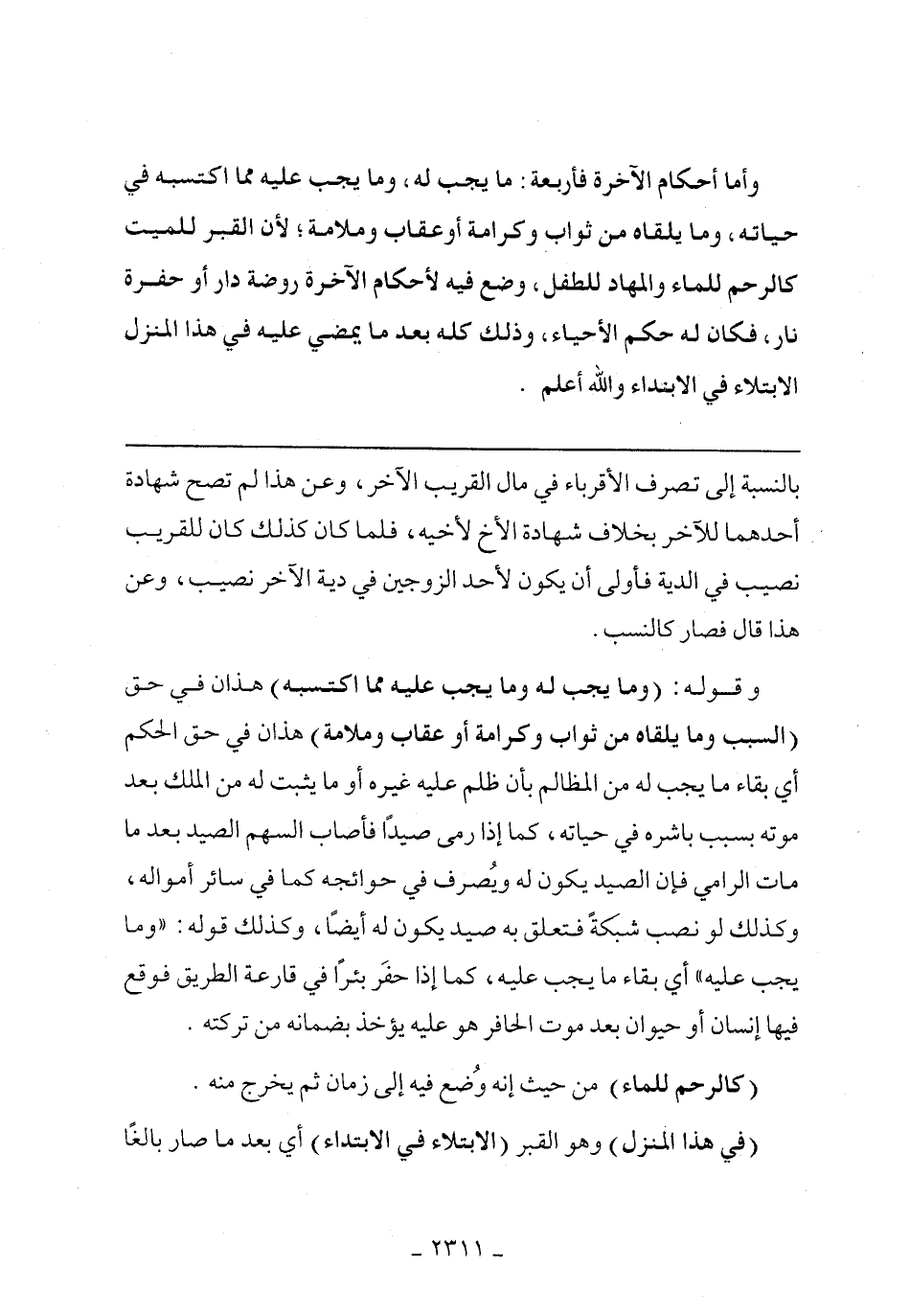 وقوله: (وما يجب له وما يجب عليه مما اكتسبه) هذا في حق (السبب وما يلقاه من ثواب وكرامة أو عقاب وملامة) هذان في حق الحكم أي بقاء ما يجب له من المظالم بأن ظلم عليه غيره أو ما يثبت له من الملك بعد موته بسبب باشره في حياته، كما إذا رمى صيدًا فأصاب السهم الصيد بعد ما مات الرامي فإن الصيد يكون له ويصرف في حوائجه كما في سائر أمواله، وكذلك لو نصب شبكة فتعلق به صيد يكون له أيضًا، وكذلك قوله: «وما يجب عليه» أي بقاء ما يجب عليه، كما إذا حفر بئرًا في قارعة الطريق فوقع فيها إنسان أو حيوان بعد موت الحافر هو عليه يؤخذ بضمانه من تركته.