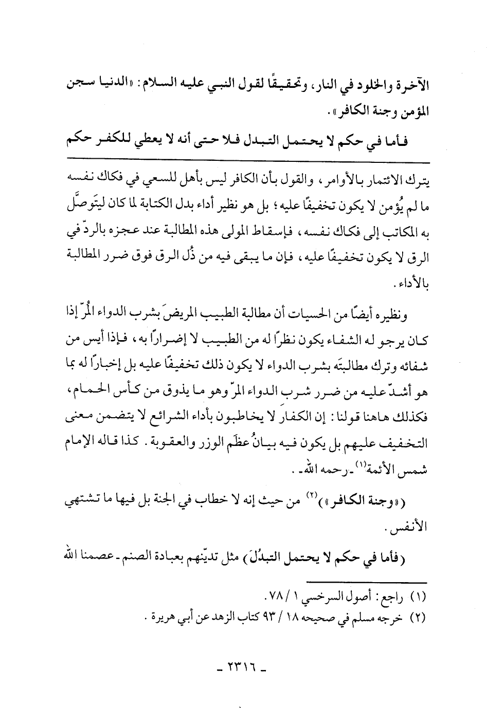 ونظيره أيضًا من الحسيات أن مطالبة الطبيب المريض بشرب الدواء المر إذا كان يرجو له الشفاء يكون نظرًا له من الطبيب لا إضرارًا به، فإذا أيس من شفائه وترك مطالبته بشرب الدواء لا يكون ذلك تخفيفًا عليه بل إخبارًا له بما هو أشد عليه من ضرر شرب الدواء المر وهو ما يذوق من كأس الحمام، فكذلك هاهنا قولنا: إن الكفار لا يخاطبون بأداء الشر ائع لا يتضمن معنى التخفيف عليهم بل يكون فيه بيان عظم الوزر والعقوبة. كذا قاله الإمام شمس الأئمة رحمه الله.