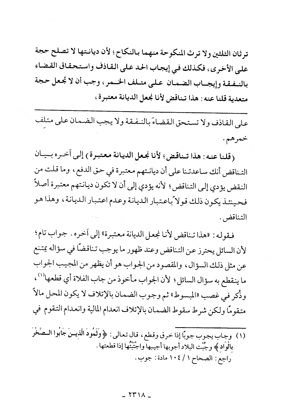 فقوله: «هذا تناقض لأنا نجعل الديانة معتبرة» إلى آخره. جواب تام؛ لأن السائل يحترز عن التناقض وعند ظهور ما يوجب تناقضًا في سؤاله يمتنع عن مثل ذلك السؤال، والمقصود من الجواب هو أن يظهر من المجيب الجواب ما ينقطع به سؤال السائل؛ لأن الجواب مأخوذ من جاب الفلاة أي قطعها؛ وذكر في غصب «المبسوط»، ثم وجوب الضمان بالإتلاف لا يكون المحل مالًا متقومًا ولكن شرط سقوط الضمان بالإتلاف انعدام المالية وانعدام التقوم في