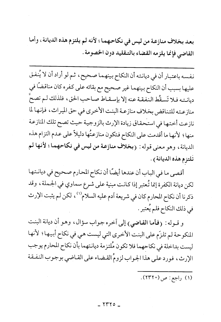 نفسه باعتبار أن في ديانته أن النكاح بينهما صحيح، ثم لو أراد أن لا ينفق عليها بسبب أن النكاح بينهما غير صحيح مع بقائه على كفره كان مناقضًا في ديانته فلا تسقط النفقة عنه إلا بإسقاط صاحب الحق، فلذلك لم تصح منازعته للتناقض بخلاف منازعة البنت الأخرى في حق الميراث، فإنها لما نازعت أختها في استحقاق زيادة الإرث بالزوجية حيث تصح تلك المنازعة منها، لأنها ما أقدمت على النكاح فتكون منازعتها دليلًا عن عدم التزام هذه الديانة، وهو معنى قوله: (بخلاف منازعة من ليس في نكاحهما، لأنها لم تلتزم هذه الديانة).