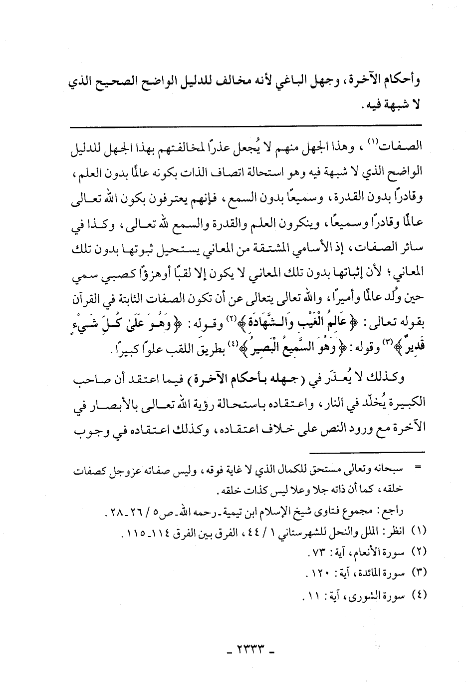 الصفات، وهذا الجهل منهم لا يجعل عذرًا لمخالفتهم بهذا الجهل للدليل الواضح الذي لا شبهة فيه وهو استحالة اتصاف الذات بكونه عالمًا بدون العلم، وقادرًا بدون القدرة، وسمعيًا بدون السمعِ، فإنهم يعترفون بكون الله تعالى عالمًا وقادرًا وسمعيًا، وينكرون العلم والقدرة والسمع لله تعالى، وكذا في سائر الصفات، إذ الأسامي المشتقة من المعاني يستحيل ثبوتها بدون تلك المعاني، لأنها إثباتها بدون تلك المعاني لا يكون إلا لقبًا أو هزؤًا كصبي سمي حين ولد عالمًا وأميرًا، والله تعالى يتعالى عن أن تكون الصفات الثابتة في القران ب قوله تعالى: (عالم الغيب والشهادة) وقوله: (وهو على كل شيء قدير) وقوله: (وهو السمعي البصير) بطريق اللقب علو كبيرًا.