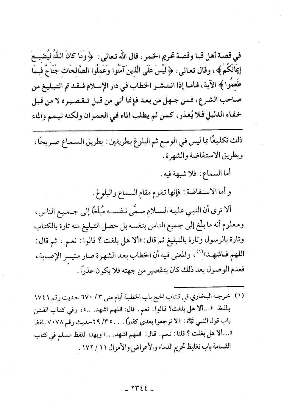 ذلك تكليفًا بما ليس في الوسع ثم البلوغ بطريقين: بطريقة السماع صريحًا، وبطريقة الاستفاضة والشهرة.