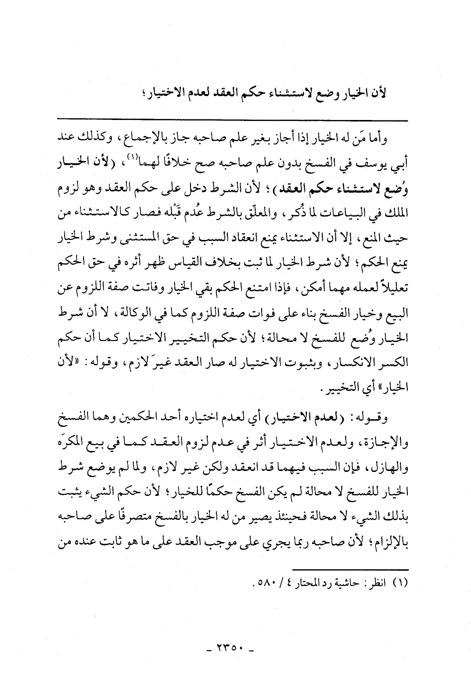 وأما من له الخيار ِإذا أجاز بغير علم صاحبه جاز بالإجماع، وكذلك عند أبي يوسف في الفسخ بدون علم ص احبه صح خلافًا لهما، (لأن الخيار وضع لاستثناء حكم العقد)، لأن الشرط دخل على حكم العقد وهو لزوم الملك في البياعات لما ذكر، والمعلق بالشرط عدم قبله فصار كالاستثناء من حيث المنع، إلا أن الاستثناء يمنع انعقاد السبب في حق المستثني وشرط الخيار يمنع الحكم، لأن شرط الخيار لما ثبت بخلاف القياس ظهر أثره في حق الحكم تعليلًا لعمله مهما أمكن، فإذا امتنع الحكم بقي الخيار وفاتت صفة اللزوم عن البيع وخيار الفسخ بناء على فوات صفة اللزوم وكما في الوكالة، لا أن أشرط الخيار وضع للفسخ لا محالة، لأن حكم التخيير الاختيار كما أن حكم الكسر الانكسار، وبثبوت الاختيار له صار العقد غير لازم، وقوله: "لأن الخيار" أي التخيير.