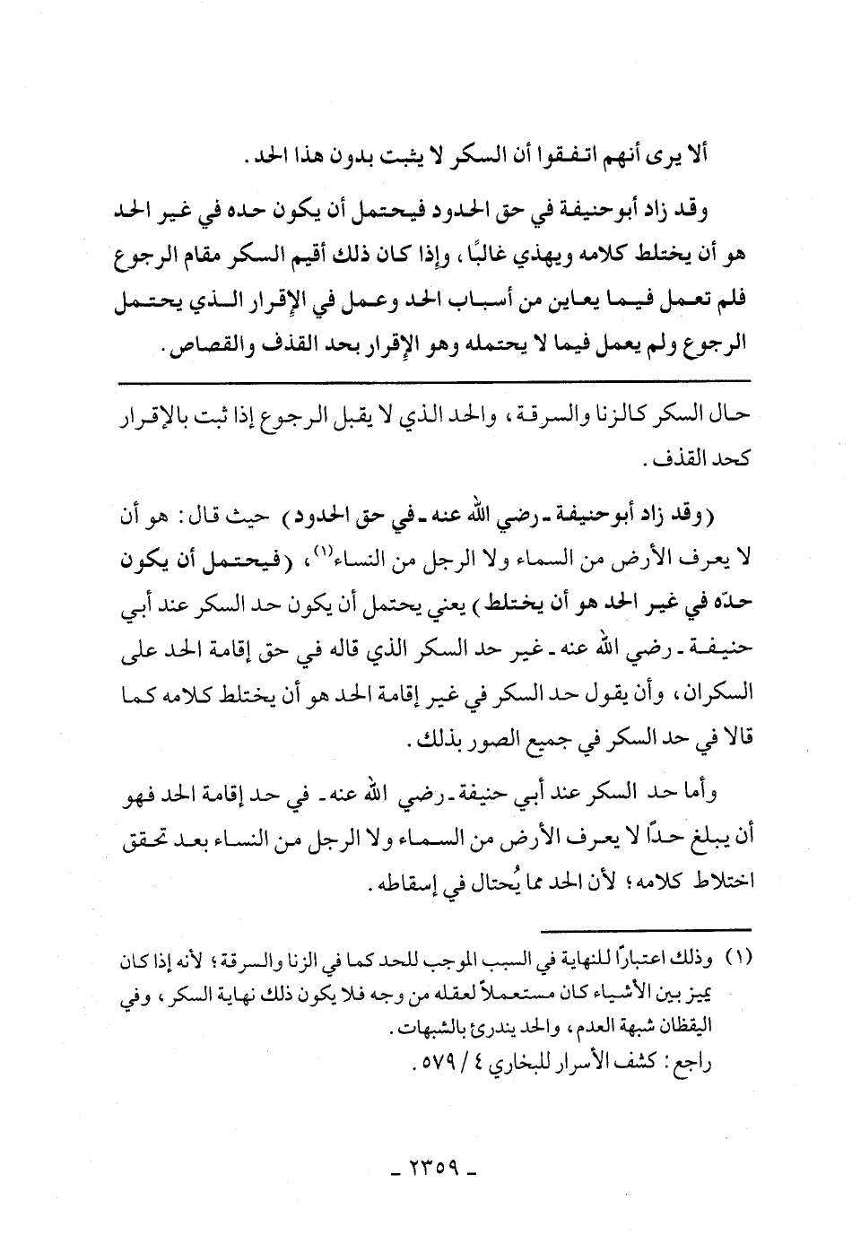 وأما حد السكر عند أبي حنيفة- رضي الله عنه- في حد إقامة الحد فهو أن يبلغ حدًا لا يعرف الأرض من السماء ولا الرجل من النساء ب عد تحقق اختلاط كلامه، لأن الحد مما يحتال في إسقاطه.