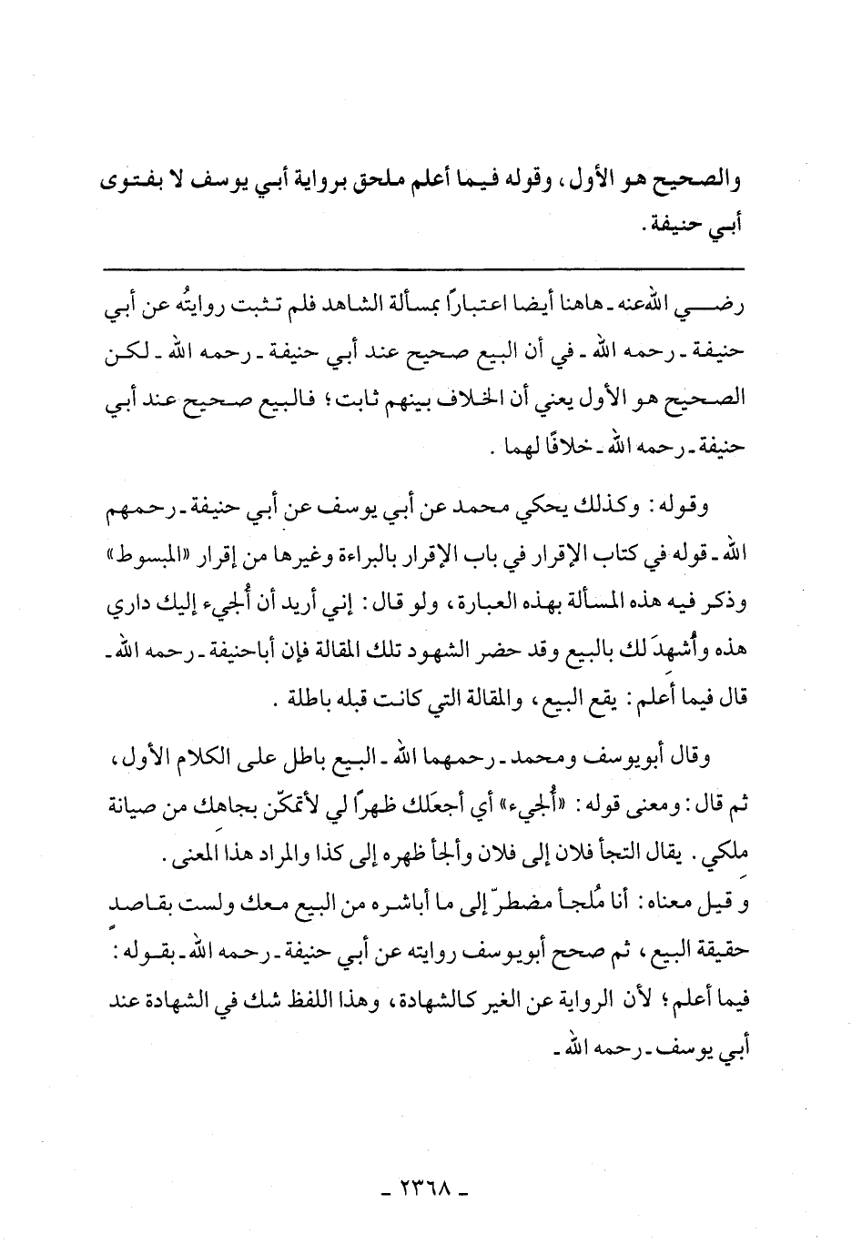 رضي الله عنه- هاهنا أيضا اعتبارًا بمسالة الشاهد فلم يثبت روايته عن أبي حنيفة- رحمه الله- في أن البيع صحيح عند أبي حنيفة- رحمه الله- لكن الصحيح هو الأول يعني أن الخلاف بينهم ثابت، فالبيع صحيح عند أبي حنيفة- رحمه الله- خلافًا لهما.