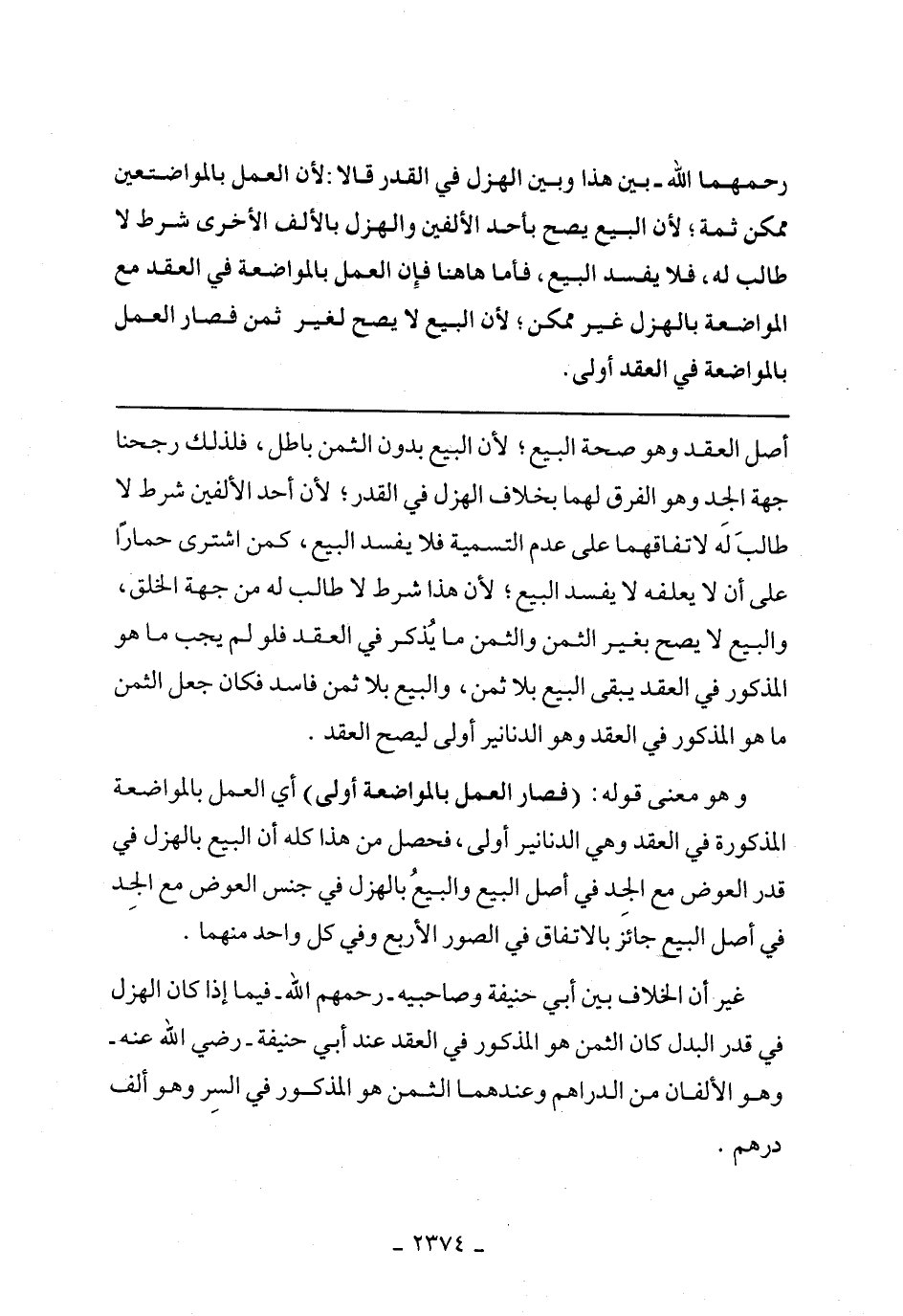 غير أن الخلاف بين أبي حنيفة وصاحبيه- رحمهم الله- فيما إذا كان الهزل في قدر البدل كان الثمن هو المذكور في العقد عند أبي حنيفة- رضي الله عنه- وهو الألفان من الدراهم وعندهما الثمن هو المذكور في السر وهو ألف درهم.