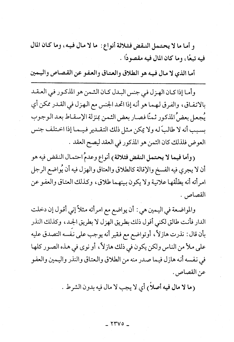 (وأما فيما لا يحتمل النقض فثلاثة) أنواع وعدم احتمال النقض فيه هو أن لا يجري ف يه الفسخ والإقالة كالطلاق والعتاق والهزل فيه أن يواضع الرجل امرأته أنه يطلقها علانية ولا يكون بينهما طلاق، وكذلك العتاق والعفو عن القصاص.