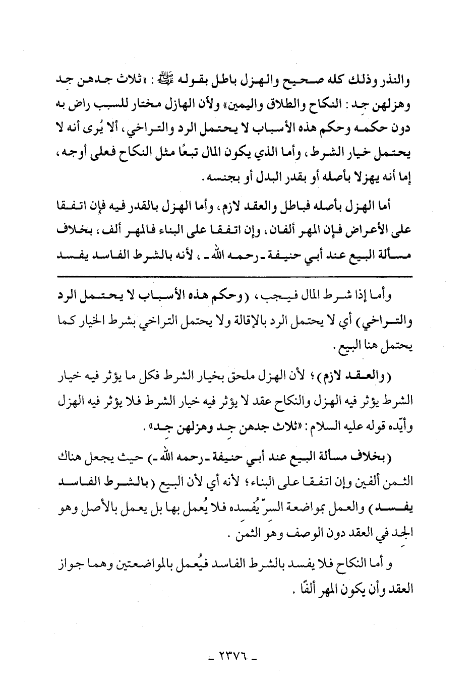 (والعقد لازم)، لأن الهزل ملحق بخيار الشرط فكل ما يؤثر فيه خيار الشرط يؤثر فيه الهزل والنكاح عقد لا يؤثر فيه خيار الشرط فلا يؤثر فيه الهزل وأيده قوله عليه السلام: "ثلاث جدهن جد وهزلهن جد".