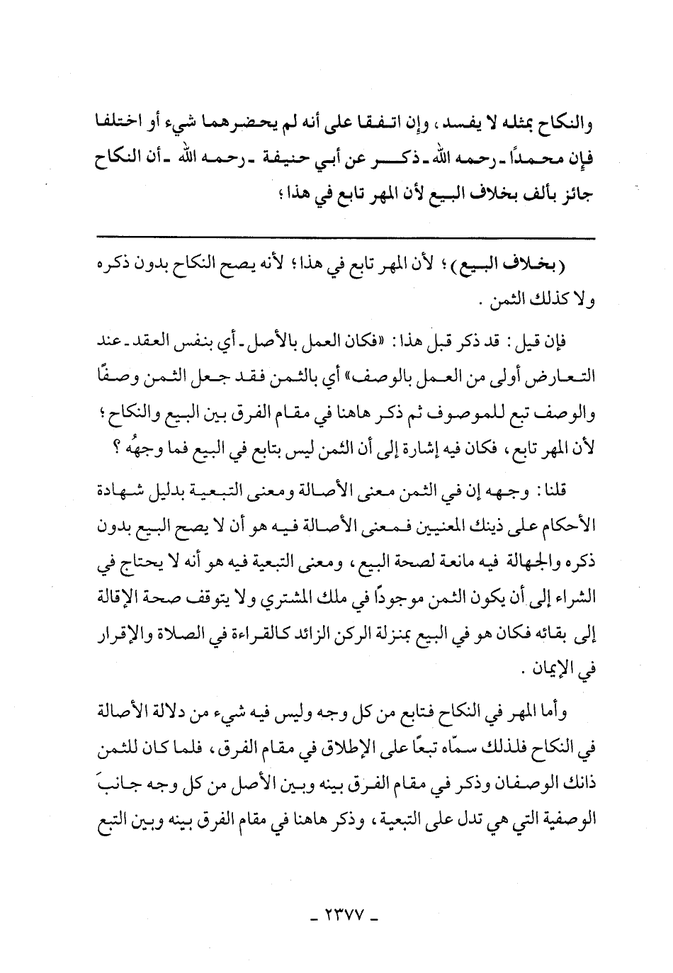 فإن قيل: قد ذكر قبل هذا: "فكان العمل بالأصل- أي بنفس العقد- عند التعارض أولي من العمل بالوصف" أي بالثمن فقد جعل الثمن وصفًا والوصف" أي بالثمن فقد جعل الثمن وصفًا والوصف تبع للموصوف ثم ذكر هاهنا في مقام الفرق بين البيع والنكاح، لأن المهر تابع، فكان فيه إشارة إلى أن الثمن ليس بتابع في البيع فما وجهه؟