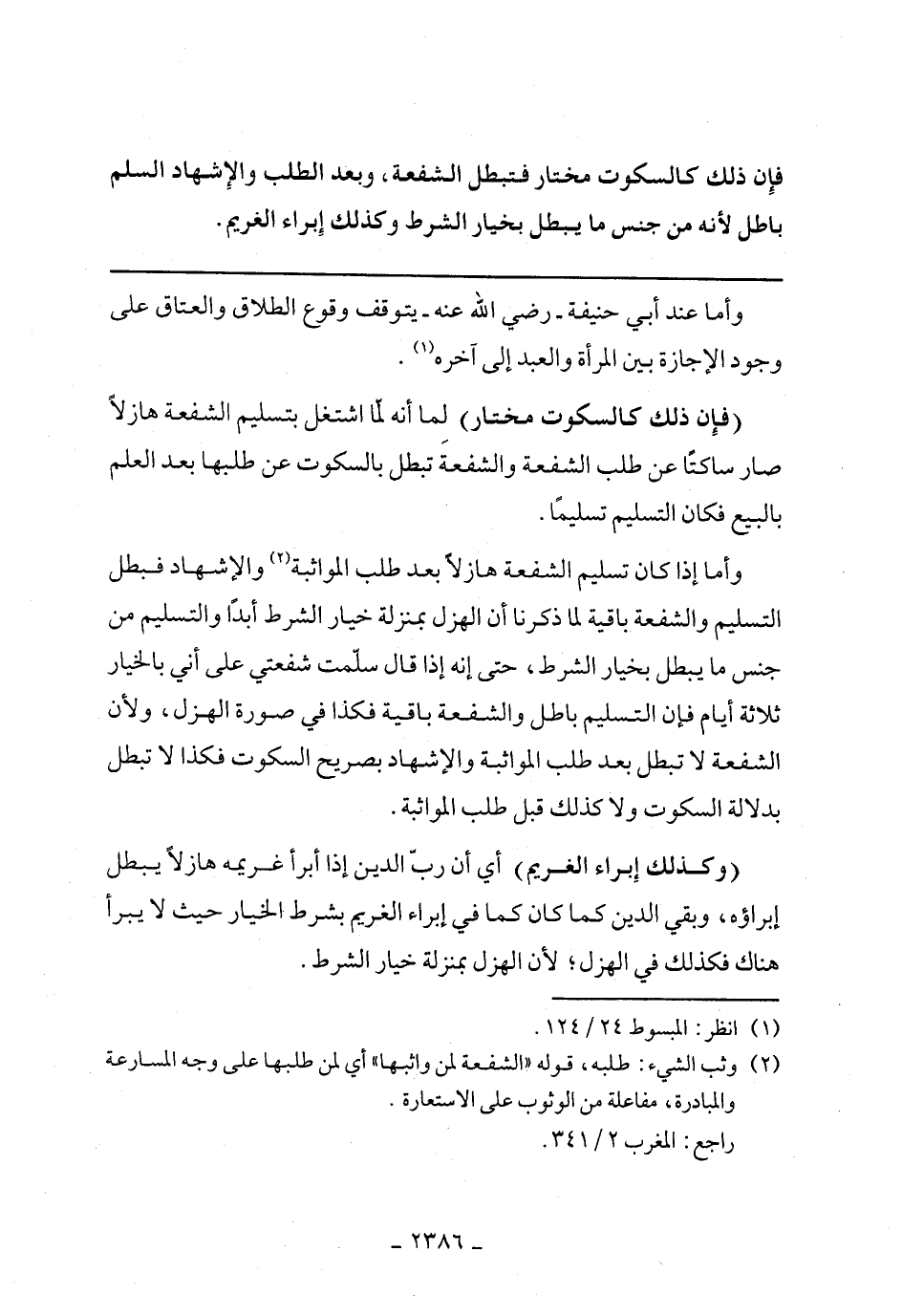 وأما إذا كان تسليم الشفعة هازلًا بعد طلب المواثبة والإشهاد فبطل التسليم والشفعة باقية لما ذكرنا أن الهزل بمنزلة خيار الشرط أبدًا والتسليم من جنس ما يبطل بخيار الشرط، حتى إنه إذا قال سلّمت شفعتي على أني بالخيار ثلاثة أيام فإن التسليم باطل والشفعة باقية فكذا فى صورة الهزل، ولأن الشفعة لا تبطل بعد طلب المواثبة والإشهاد بصريح السكوت فكذا لا تبطل بدلالة السكوت ولا كذلك قبل طلب المواثبة.
