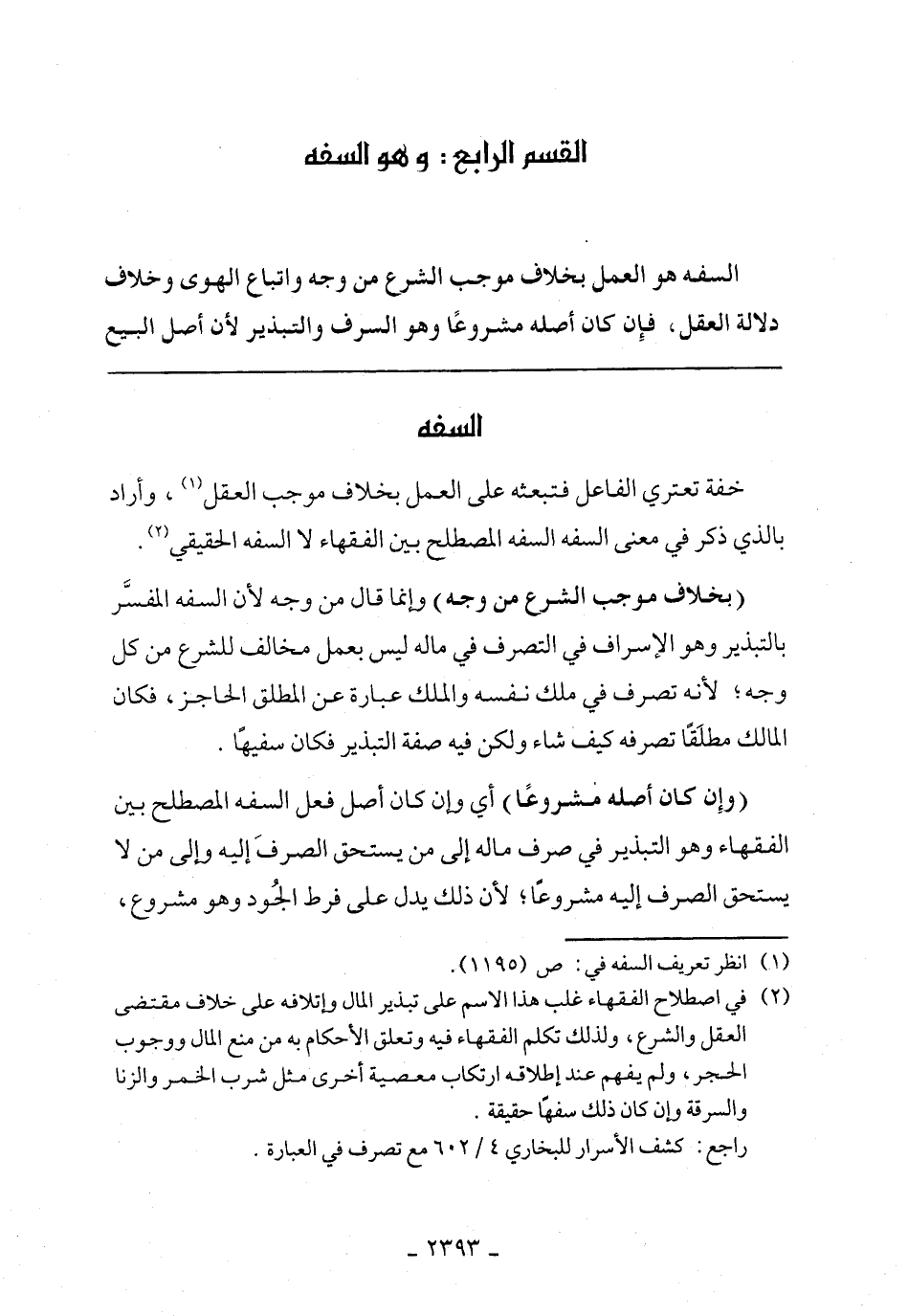 (بخلاف موجب الشرع من وجه) وإنما قال من وجه لأن السفه المفسر بالتبذير وهو الإسراف في التصرف في ماله ليس بعمل مخالف للشرع من كل وجه؛ لأنه تصرف في ملك نفسه والملك عبارة عن المطلق الحاجز، فكان المالك مطلقا تصرفه كيف شاء ولكن فيه صفة التبذير فكان سفيها.