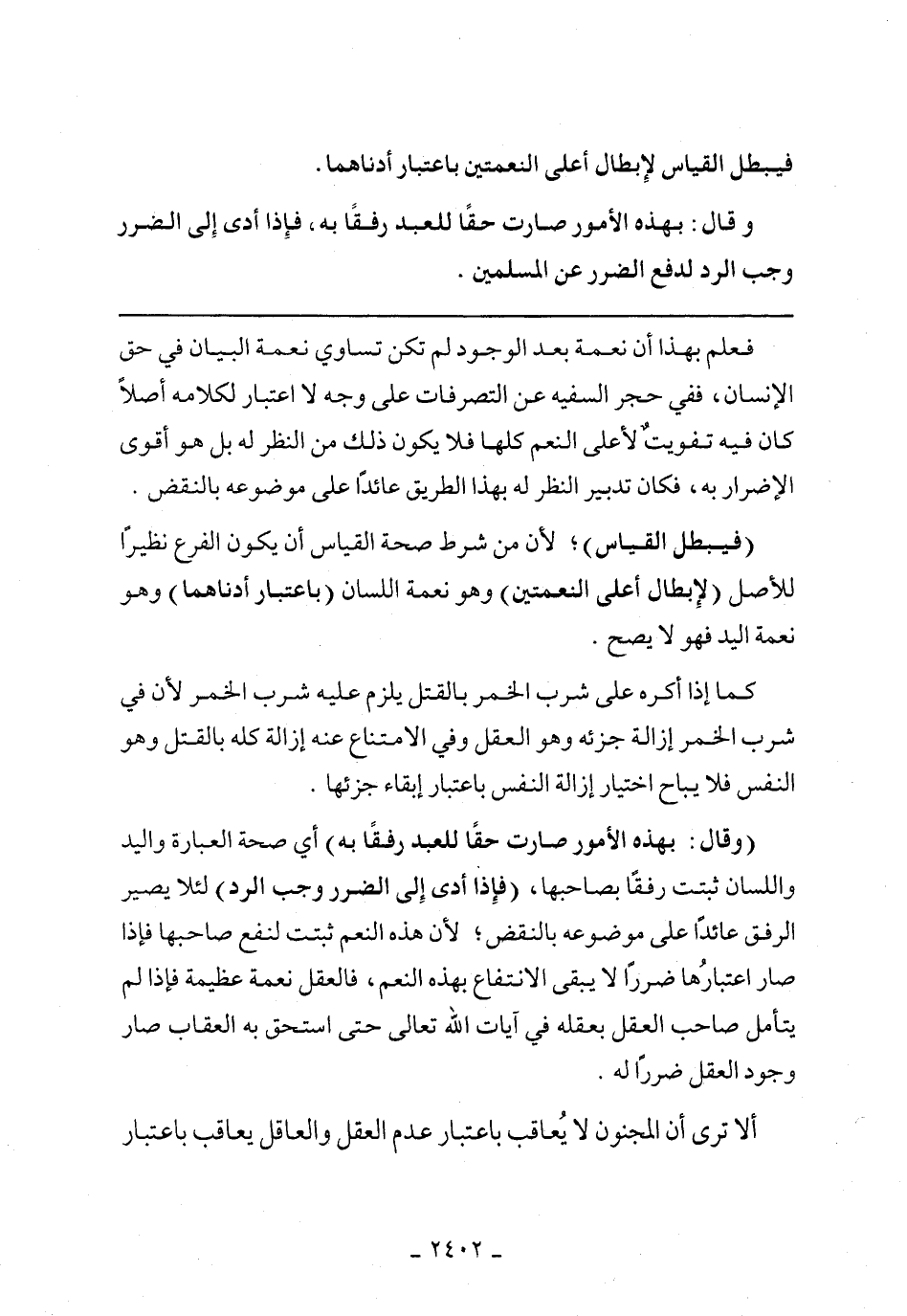 (وقال: بهذه الأمور صارت حقا للعبد رفقا به) أي صحة العبارة واليد واللسان تثبت رفقا يصاحبها، (فإذا أدى إلى الضرر وجب الرد) لئلا يصير الرفق عائدا على موضوعه بالنقض؛ لأن هذه النعم تثبت لنفع صاحبها فإّذا صار اعتبارها ضررا لا يبقى الانتفاع بهذه النعم، فالعقل نعمة عظيمة فإذا لم يتأمل صاحب العقل بعقله في آيات الله تعالى حتى استحق به العقاب صار وجود العقل ضررا له.