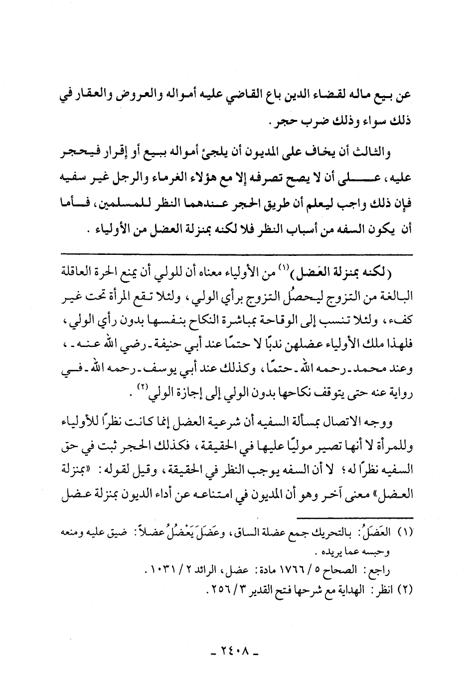 ووجه الاتصال بمسألة السفيه أن شرعية العضل إنما كانت نظرًا للأولياء وللمرأة لا أنها تصير موليًا عليها في الحقيقة، فكذلك الحجر ثبت في حق السفيه نظرًا له؛ لا أن السفه يوجب النظر في الحقيقة، وقيل لقوله: "بمنزلة العضل" معنى أخر وهو أن المديون في امتناعه عن أداء الديون بمنزلة عضل