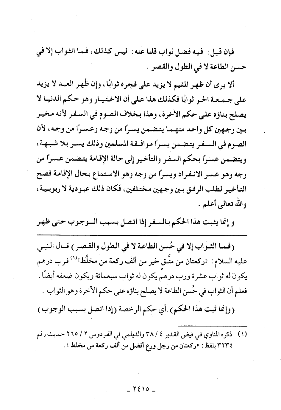 (فما الثواب إلا في حسن الطاعة لا في الطول والقصر) قال النبي عليه السلام: "ركعتان من متق خير من ألف ركعة من مخلط" فرب درهم يكون له ثواب عشرة ورب درهم يكون له ثواب سبعمائة ويكون ضعفه أيضًا.