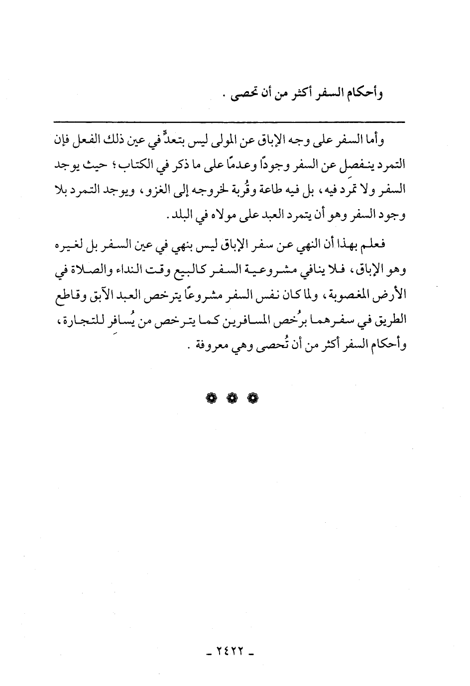 فعلم بهذا أن النهي عن سفر الإباق ليس بنهي في عين السفر بل لغيره وهو الإباق، فلا ينافي مشروعية السفر كالبيع وقت النداء والصلاة في الأرض المغصوبة، ولما كان نفس السفر مشروعا يترخص العبد الآبق وقاطع الطريق في سفرهما برخص المسافرين كما يترخص من يسافر للتجارة، وأحكام السفر أكثر من أن تحصى وهي معروفة.