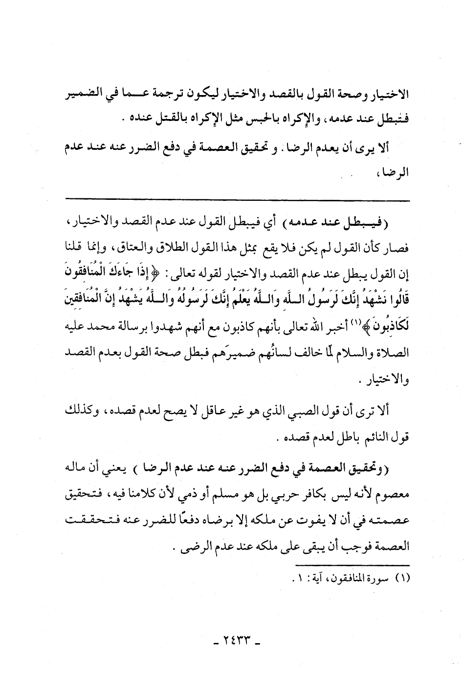 (فيبطل عند عدمه) أي فيبطل القول عند عدم القصد والاختيار، فصار كأن القول لم يكن فلا يقع بمثل هذا القول الطلاق والعتاق، وإنما قلنا إن القول يبطل عند عدم القصد والاختيار لقوله تعالى: ((إِذَا جَاءَكَ الْمُنَافِقُونَ قَالُوا نَشْهَدُ إِنَّكَ لَرَسُولُ اللَّهِ وَاللَّهُ يَعْلَمُ إِنَّكَ لَرَسُولُهُ وَاللَّهُ يَشْهَدُ إِنَّ الْمُنَافِقِينَ لَكَاذِبُونَ)) أخبر الله تعالى بأنهم كاذبون مع أنهم شهدوا برسالة محمد عليه الصلاة والسلام لما خالف لسانهم ضميرهم فبطل صحة القول بعدم القصد والاختيار.