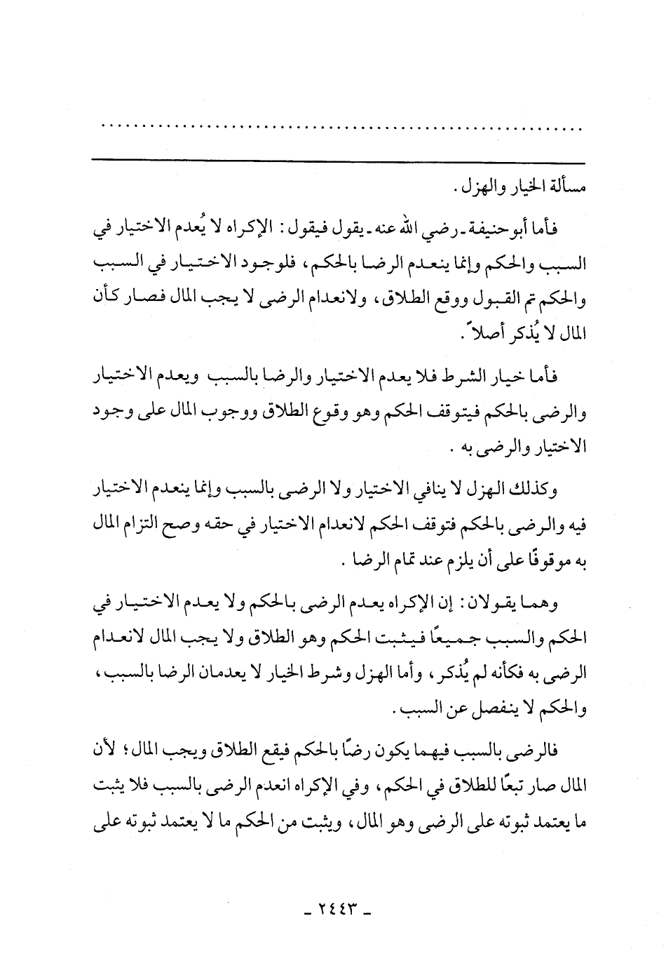 فأما أبو حنيفة -رضي الله عنه- يقول فيقول: الإكراه لا يعدم الاختيار في السبب والحكم وإنما ينعدم الرضا بالحكم، فلوجود الاختيار في السبب والحكم تم القبول ووقع الطلاق، ولانعدام الرضى لا يجب المال فصار كأن المال لا يذكر أصلا.