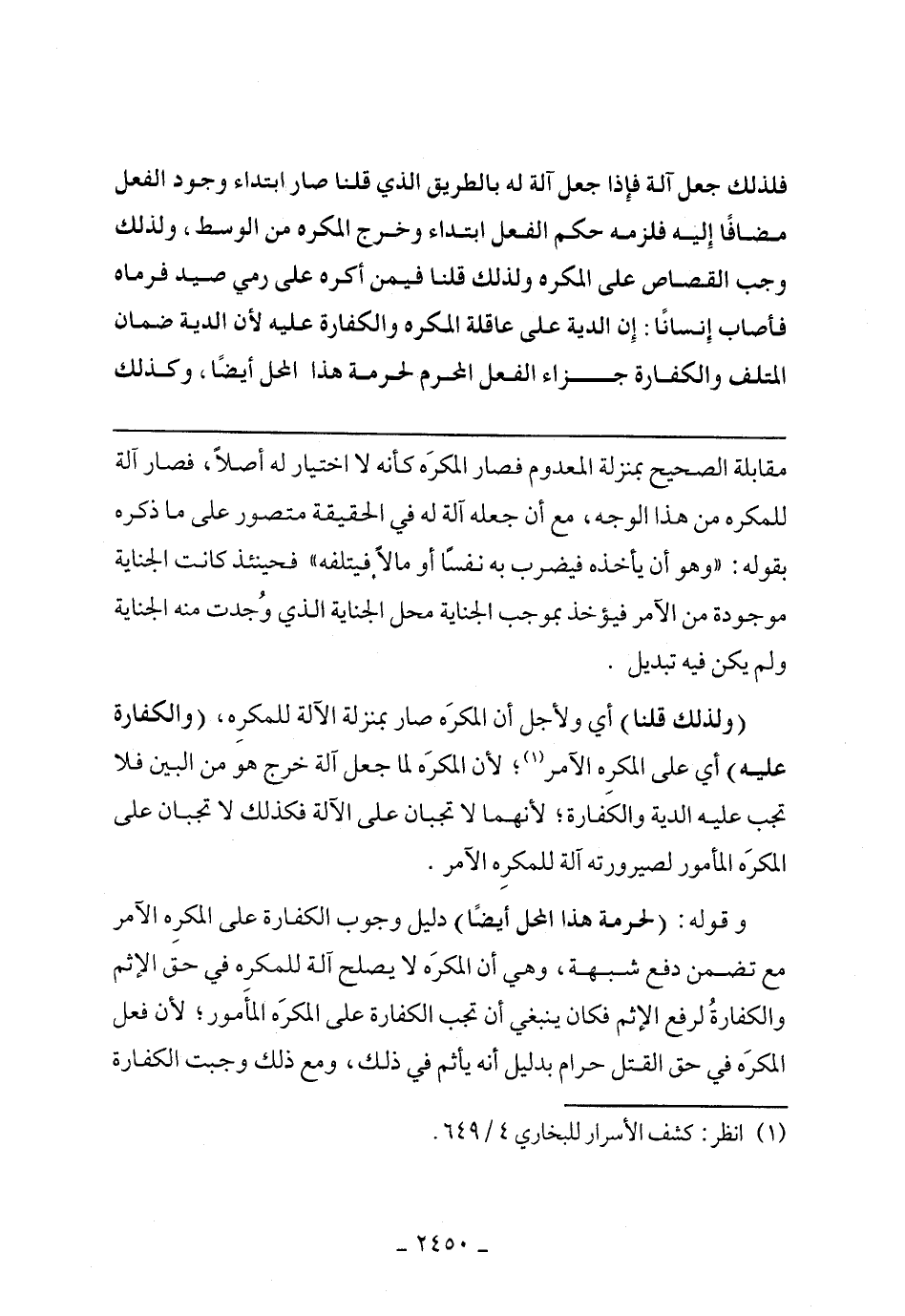 مقابلة الصحيح بمنزلة المعدوم فصار المكره كأنه لا اختيار له أصلًا، فصار آلة للمكره من هذا الوجه، مع أن جعله آله له في الحقيقة متصور على ما ذكره بقوله: "وهوأن ياخذه فيضرببه نفسًا أومالًا فيتلفه" فحينئذ كانت الجناية موجودة من الآمر فيؤخذ بموجب الجناية محل الجناية الذ وجدت منه الجناية ولم يكن فيه تبديل.
