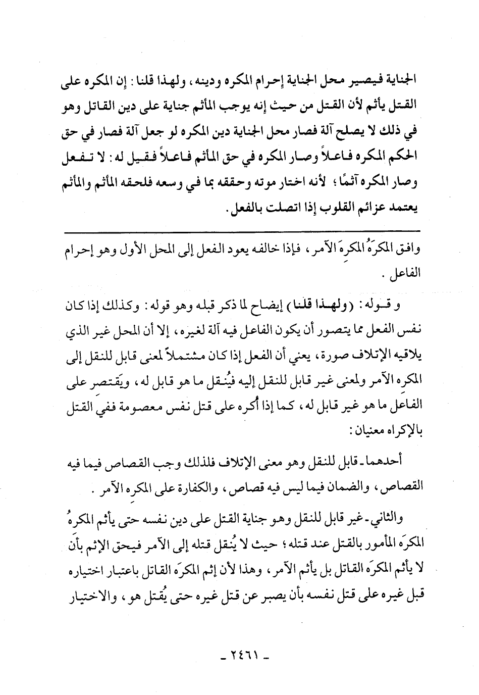 والثاني- غير قابل للنقل وهو جناية القتل على دين نفسه حى يأثم المكره المكره المأمور بالقتل عند قتله؛ حيث لا ينقل قتله إلى الآمر فيحق الإثم بأن لا يأثم المكره القاتل بل يأثم الآمر، وهذا لأن إثم المكره القاتل باعتبار اختياره قبل غيره على قتل نفسه بأن يصبر عن قتل غيره حتى يقتل هو، والاخيتار