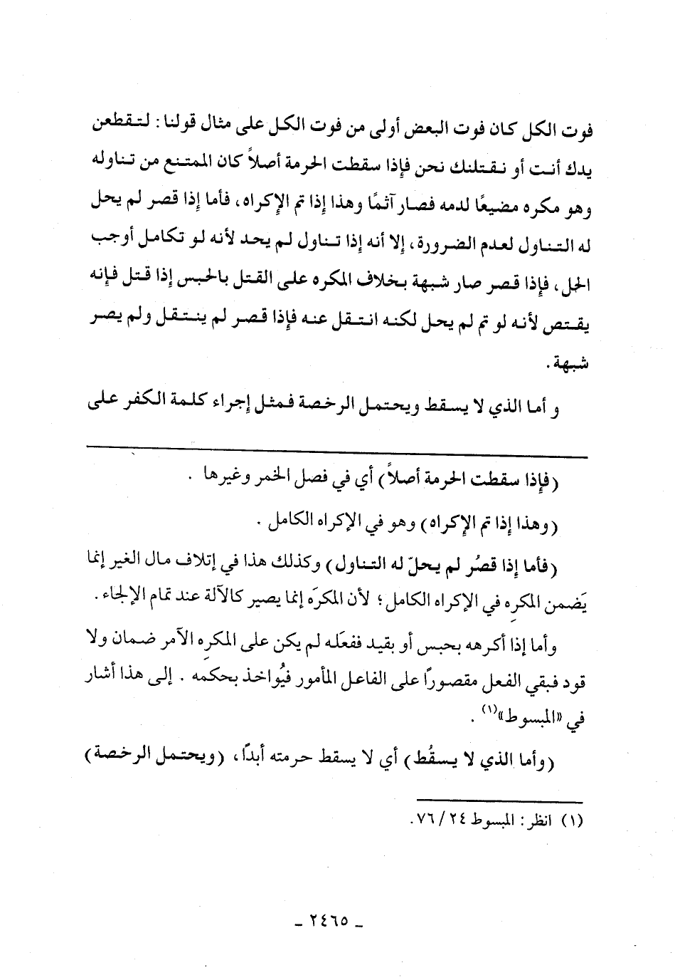 وأما إذا أكرهه بحبس أو بقيد ففعله لم يكن على المكره الآمر ضمان ولا قود فبقي الفعل مقصورًا على الفاعل المأمور فيواخذ بحكمه. إلى هذا أشار في "المبسوط".