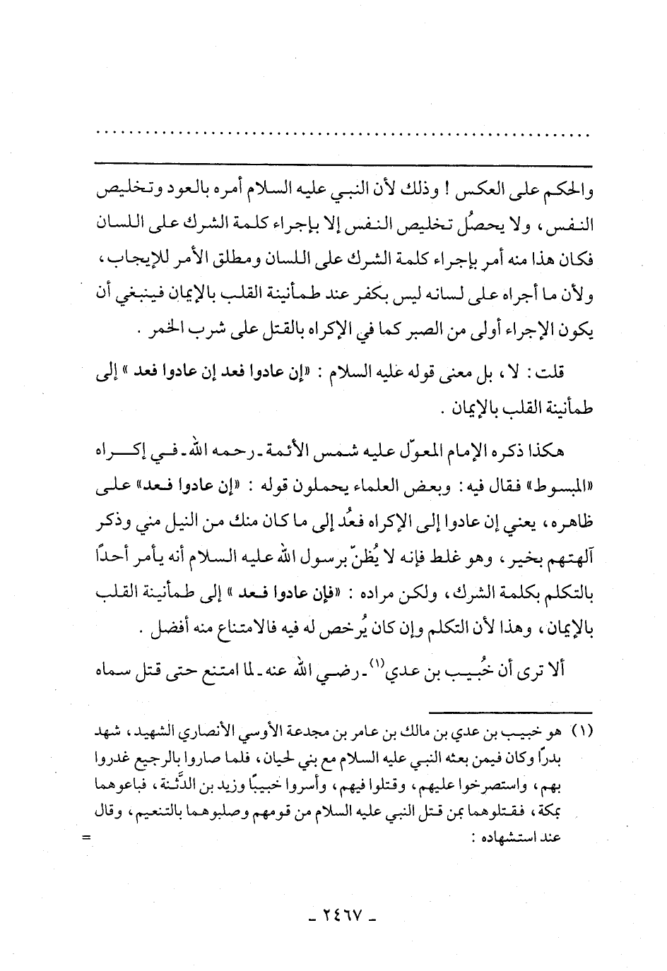 هكذا ذكره الإمام المعو عليه شمس الأئمة- رحمه الله- في إكراه "المبسوط" فقال فيه: وبعض العلماء يحملون قوله: "إن عادوا فعد" على ظاهره، يعني إن عادوا إلى الإكراه فعد إلى ما كان منك من النيل مني وذكر آلهتهم بخير، وهو غلط فإنه لا يظن برسول اله عليه السلام أنه يأمر أحدًا بالتكلم بكلمة الشرك، ولكن مراده: "فإن عادوا فعد" إلى طمأنينة القلب بالإيمان، وهذا لأن التكلم وإن كان يرخص له فيه فالامتناع منه أفضل.