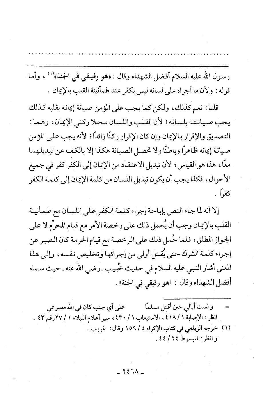 رسول الله عليه السلام أفضل الشهداء وقال: "هو رفيقي في الجنة"، وأما قوله: ولأن ما أجراه على لسانه ليس بكفر عند طمأنينة القلب بالإيمان.