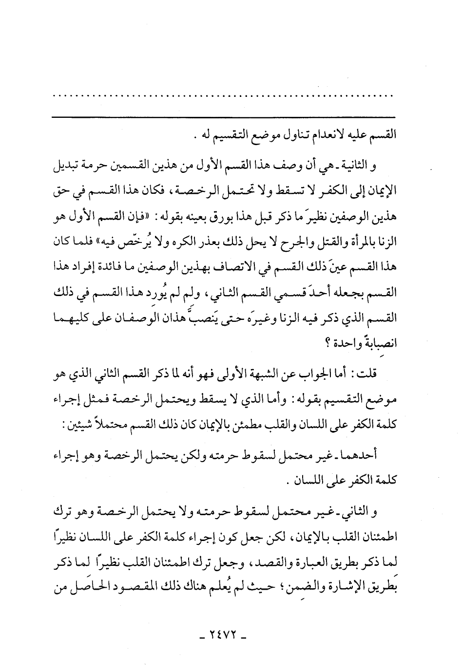 قلت: أما الجواب عن الشبهة الأولى فهو أنه لما ذكر القسم الثاني الذي هو موضع التقسيم بقوله: وأما الذي لا يسقط ويحتمل الرخصة فمثل إجراء كلمة الكفر على اللسان والقلب مطمئن بالإيمان كان ذلك القسم محتملا شيئين:
