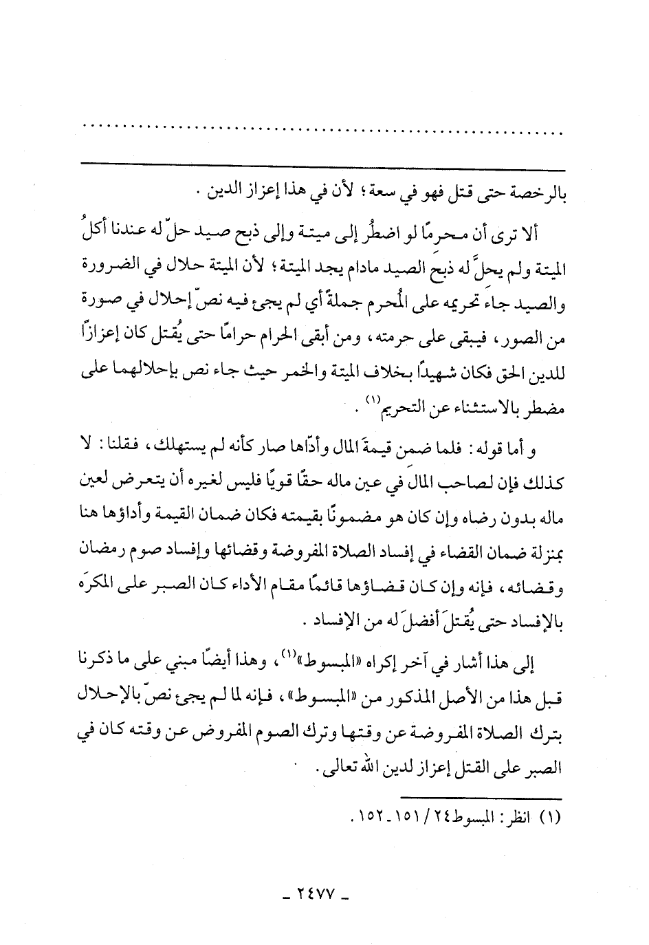 ألا ترى أن محرما لو اضطر إلى ميتة وإلى ذبح صيد حل له عندنا أكل الميتة ولم يحل له ذبح الصيد ما دام يجد الميتة؛ لأن الميتة حلال في الضرورة والصيد جاء تحريمه على المحرم جملة أي لم يجيء فيه نص إحلال في صورة من الصور، فيبقى على حرمته، ومن أبقى الحرام حراما حتى يقتل كان إعزازا للدين الحق فكان شهيدا بخلاف الميتة والخمر حيث جاء نص بإحلالهما على مضطر بالاستثناء عن التحريم.