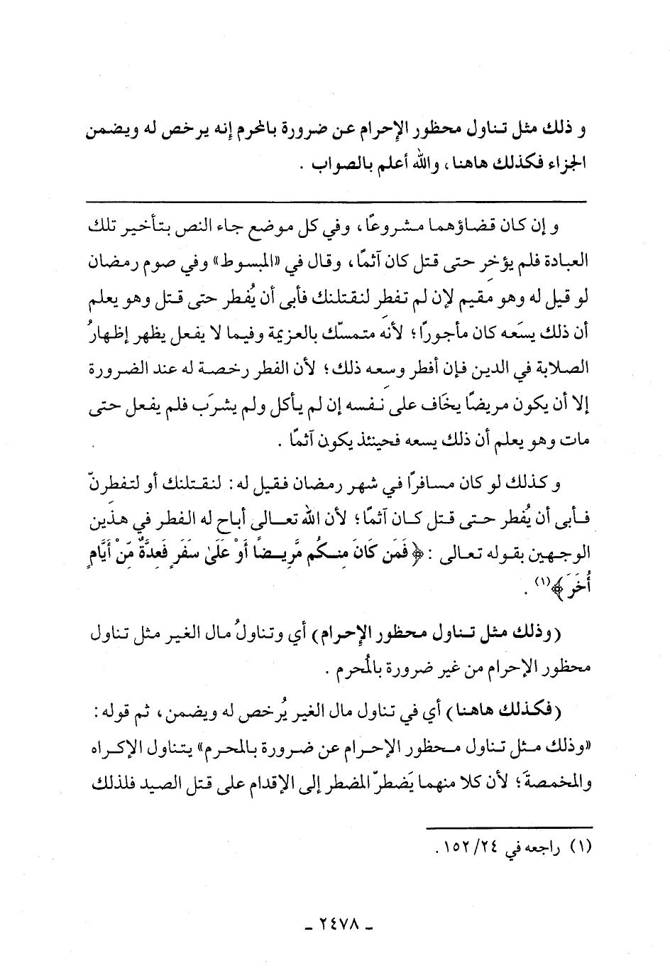وكذلك لو كان مسافرًا في شهر رمضان فقيل له: لنقتلنك أو لتفطرن فأبى أن يفطر حتى قتل كان أثمًا؛ لأن الله تعالى أباح له الفطر في هذين الوجهين بقوله تعالى: (فَمَن كَانَ مِنكُم مَّرِيضًا أَوْ عَلَى سَفَرٍ فَعِدَّةٌ مِّنْ أَيَّامٍ أُخَرَ)