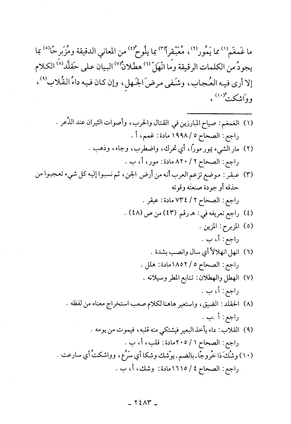 ما غمغم مما يمور، معبقرًا بما يلوح من المعاني الدقيقة ومزبرحا بما يجود من الكلمات الرقيقة وما انهل هطلان البيان على حقلد الكلام إلا أرى فيه العجاب، وشفى مرض الجهل، وإن كان فيه داء القلاب، وواشكت،