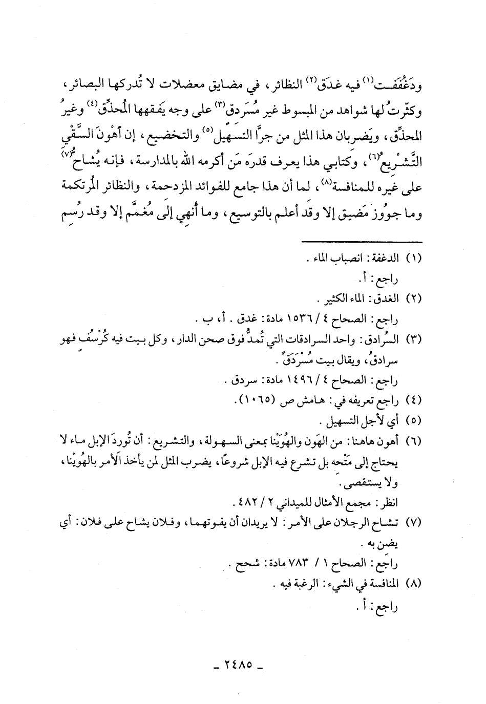 ودغففت فيه غدق النظائر، في مضايق معضلات لا تدركها البصائر، وكثرت لها شواهد من المبسوط غير مسردق على وجه يفقهها المحذق وغير المحذق، ويضربان هذا المثل من جرا التسهيل والتخضيع، إن أهون السقي التشريع، وكتابي هذا يعرف قدره من أكرمه الله بالمدارسة، فإنه يشاح على غيره للمنافسة، لما أن هذا جامع للفوائد المزدحمة، والنظائر المرتكمة وما جووز مضيق إلا وقد أعلم بالتوسيع، وما أنهي إلى مغمم إلا وقد رسم