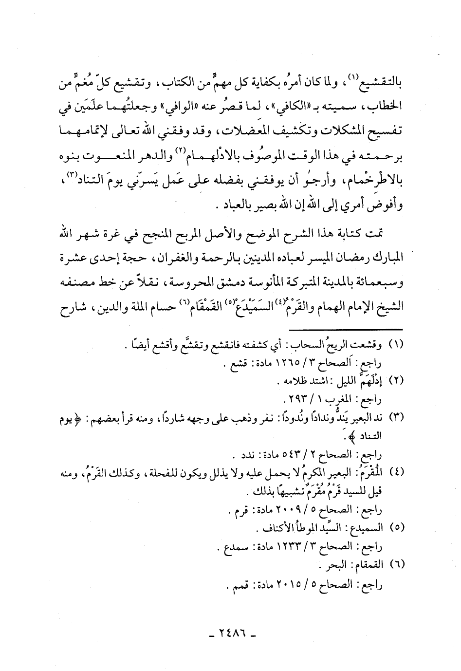 بالتقشيع، ولما كان أمره بكفاية كل مهم من الكتاب، وتقسيع كل مغم من الخطاب، سميته ب"الكافي" وجعلتها علمين في تفسيح المشكلات وتكشيف المعضلات، وقد وفقني الله تعالى لإتمامهما برحمته في هذا الوقت الموصوف بالادلهمام والدهر المنعوت بنوه بالاطرخمام، وأرجو أن يوفقني بفضله على عمل يسرني يوم التناد، وأفوض أمري إلى الله إن الله بصير بالعباد.