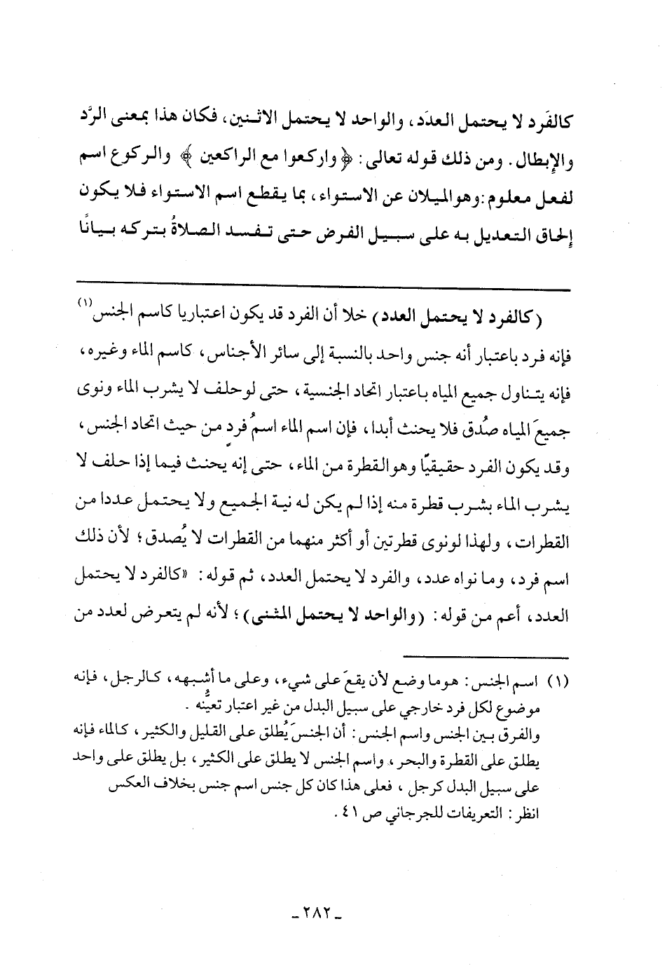(كالفرد لا يحتمل العدد) خلا أن الفرد قد يكون اعتباريا كاسم الجنس فإنه فرد باعتبار أنه جنس واحد بالنسبة إلى سائر الأجناس، كاسم الماء وغيره، فإنه يتناول جميع المياه باعتبار اتحاد الجنسية، حتى لو حلف لا يشرب الماء ونوى جميع المياه صدق فلا يحنث أبدًا، فإن اسم الماء اسم فرد من حيث اتحاد الجنس، وقد يكون الفرد حقيقيًا وهو القطرة من الماء، حتى أنه يحنث فيما إذا حلف لا يشرب الماء بشرب قطرة منه إذا لم يكن له نية الجميع ولا يحتمل عددا من القطرات، ولهذا لو نوى قطرتين أو أكثر منهما من القطرات لا يصدق؛ لأن ذلك اسم فرد، وما نواه عدد، والفرد لا يحتمل العدد، ثم قوله: (كالفرد لا يحتمل العدد، أعلم من قوله: (والواحد لا يحتمل المثنى)؛ لأنه لم يتعرض لعدد من