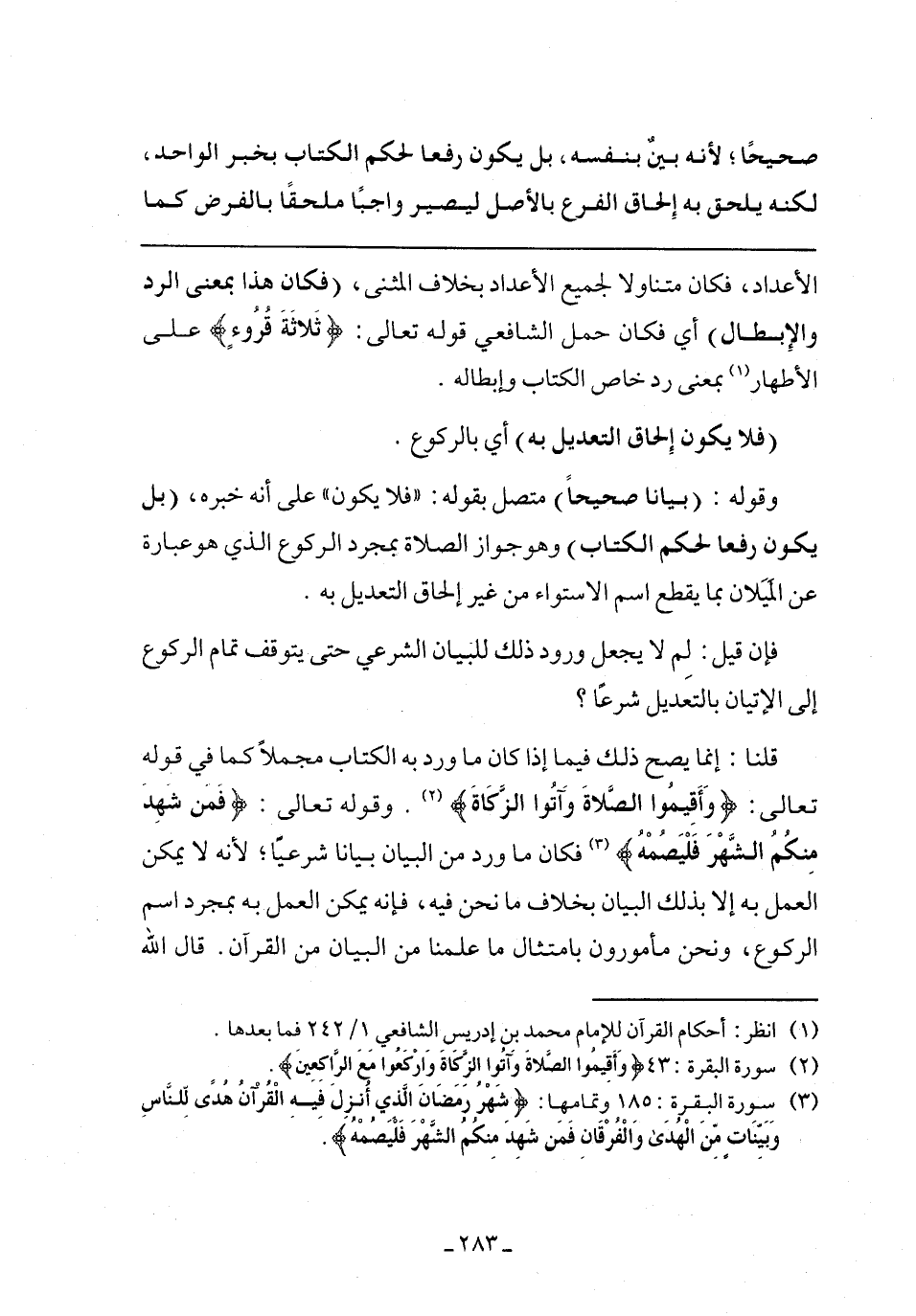 قلنا: {وَأَقِيمُوا الصَّلاةَ وَآتُوا الزَّكَاةَ}. وقوله {فَمَنْ شَهِدَ مِنْكُمُ الشَّهْرَ فَلْيَصُمْهُ} فكان ما ورد من البيان بيانًا شرعيًا؛ لأنه لا يمكن العمل به إلا بذلك البيان بخلاف ما نحن فيه، فإنه يمكن العمل به بمجرد اسم الركوع، ونحن مأمورون بامتثال ما علمنا من البيان من القرآن. قال الله