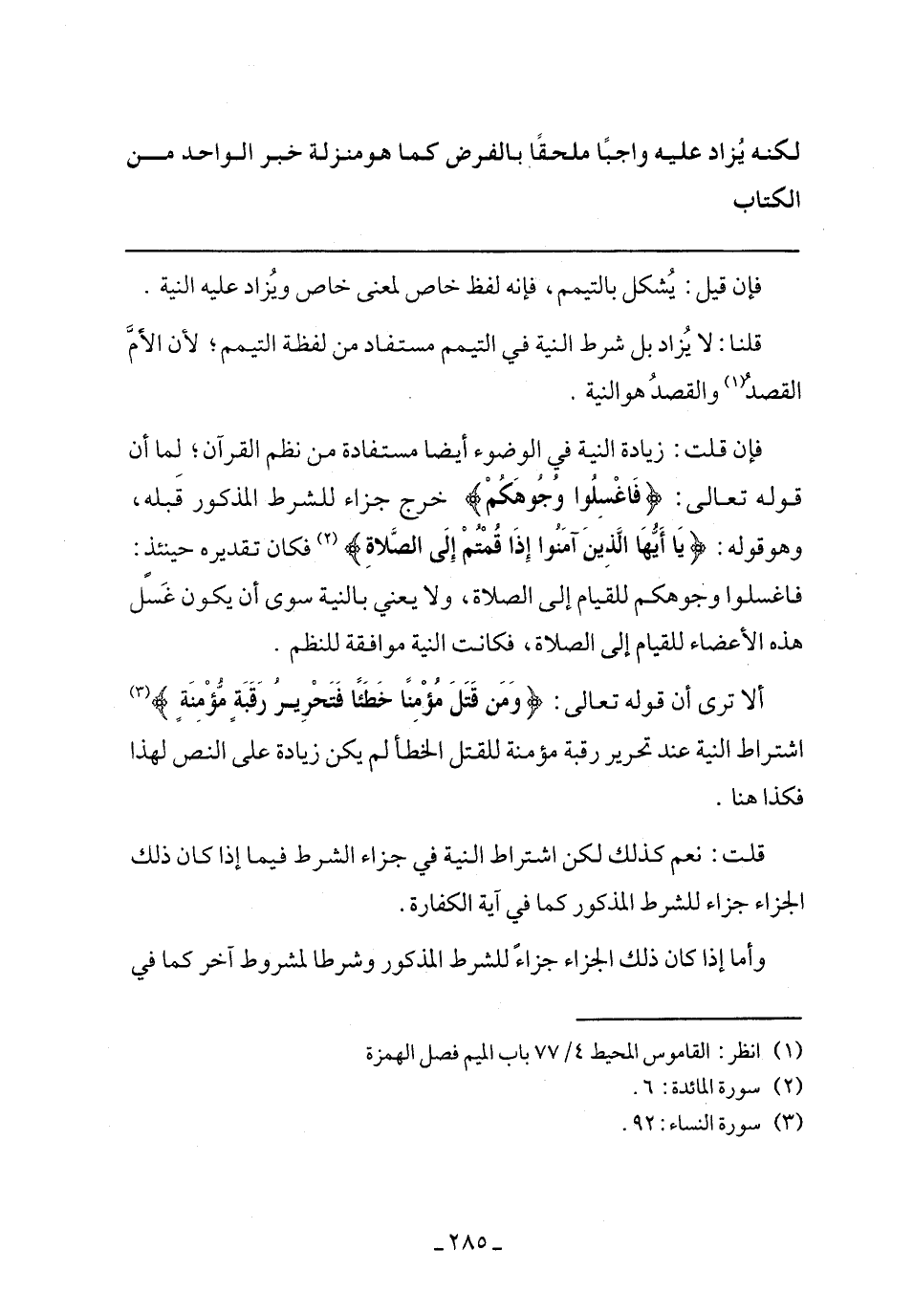 ألا ترى أن قوله تعالى: {وَمَنْ قَتَلَ مُؤْمِنًا خَطًَا فَتَحْرِيرُ رَقَبَةٍ مُؤْمِنَةٍ} اشتراط النية عند تحرير رقبة مؤمنة للقتل الخطأ لم يكن زيادة على النص لهذا فكذا هنا.