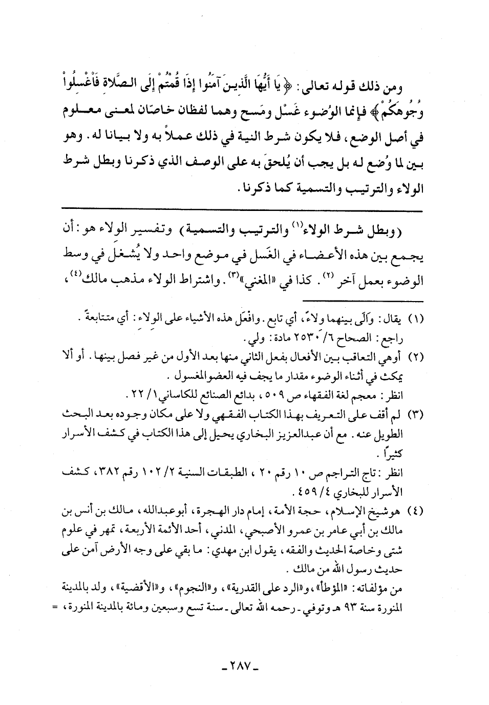 (وبطل شرط الولاء والترتيب والتسمية) وتفسير الولاء هو: أن يجمع بين هذه الأعضاء في الغسل في موضع واحد ولا يشغل في وسط الوضوء بعمل آخر. كذا في "المغني". واشتراط الولاء مذهب مالك،