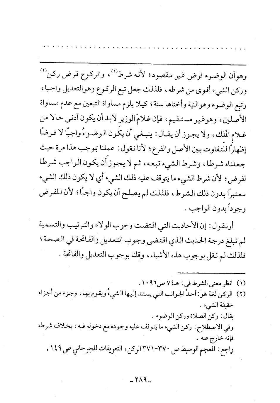 وهو أن الوضوء فرض غير مقصود؛ لأنه شرط، والركوع فرض ركن وركن الشيء أقوى من شرطه، فلذلك جعل تبع الركوع وهو التعديل واجبًا، وتبع الوضوء وهو النية وأختاها سنة؛ كيلا يلزم مساواة التبعين مع عدم مساواة الأصلين، وهو غير مستقيم، فإن غلام الوزير لابد أن يكون أدنى حالًا من غلام الملك، ولا يجوز أن يقال: ينبغي أن يكون الوضوء واجبًا لا فرضًا إظهارًا للتفاوت بين الأصل والفرع؛ لأنا نقول: عملنا بموجب هذا مرة حيث جعلناه شرطًا، وشرط الشيء تبعه، ثم لا يجوز أن يكون الواجب شرطًا لفرض؛ لأن شرط الشيء ما يتوقف عليه ذلك الشيء أي لا يكون ذلك الشيء معتبرًا بدون ذلك الشرط، فلذلك لم يصلح أن يكون واجبًا؛ لأن للفرض وجودًا بدون الواجب.