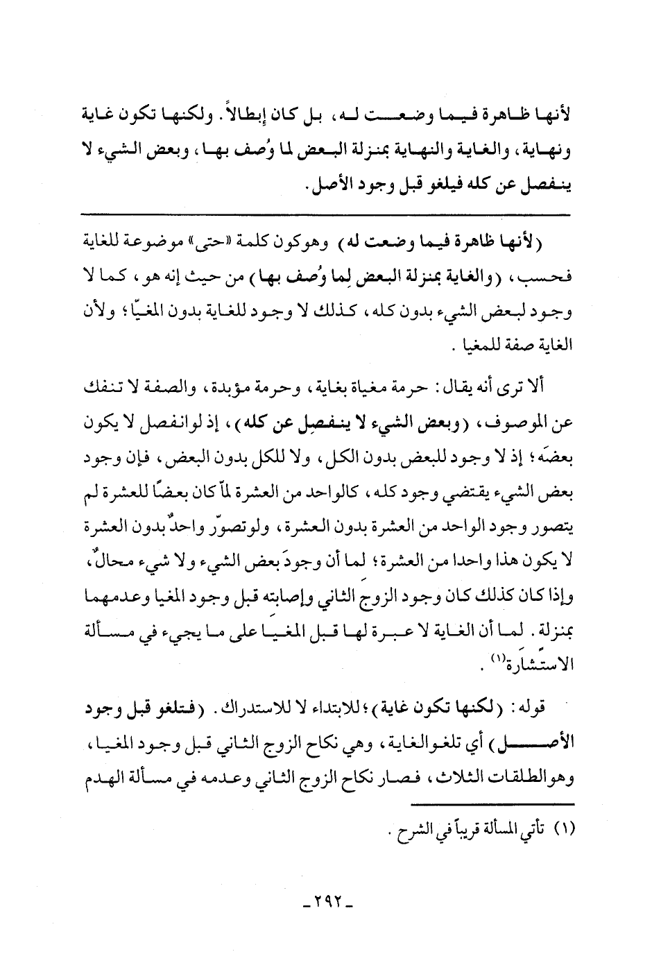 ألا ترى أنه يقال: حرمة مغياة بغاية، وحرمة مؤبدة، والصفة لا تنفك عن الموصوف، (وبعض الشيء لا ينفصل عن كله)، إذ لو انفصل لا يكون بعضه؛ إذ لا وجود للبعض بدون الكل، ولا للكل بدون البعض، فإن وجود بعض الشيء يقتضي وجود كله، كالواحد من العشرة لما كان بعضًا للعشرة لم يتصور وجود الواحد من العشرة بدون العشرة، ولو تصور واحد بدون العشرة لا يكون هذا واحدًا من العشرة؛ لما أن وجود بعض الشيء ولا شيء محال، وإذا كان كذلك كان وجود الزوج الثاني وإصابته قبل وجود المغيا وعدمهما بمنزلة. لما أن الغاية لا عبرة لها قبل المغيا على ما يجيء في مسألة الاستشارة.