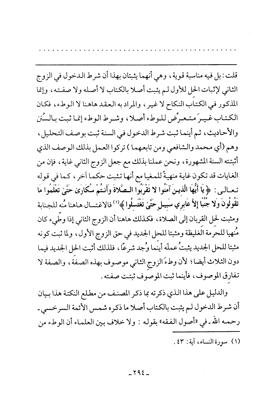 قلت: بل فيه مناسبة قوية، وهي أنهما يثبتان بهذا أن شرط الدخول في الزوج الثاني لإثبات الحل للأول لم يثبت أصلا بالكتاب لا أصله ولا صفته، وإنما المذكور في الكتاب النكاح لا غير، والمراد به العقد هاهنا لا الوطء، فكان الكتاب غير متعرض للوطء أصلًا، وشرط الوطء إنما ثبت بالسنن والأحاديث، ثم أينما ثبت شرط الدخول في السنة ثبت بوصف التحليل، وهم (أي محمد والشافعي ومن تابعهما) تركوا العمل بذلك الوصف الذي أثبتته السنة المشهورة، ونحن عملنا بذلك مع جعل الزوج الثاني غاية، فإن من الغايات قد تكون غاية للمغيا مع أنها تثبت حكمًا آخر، كما في قوله تعالى: (يَا أَيُّهَا الَّذِينَ آمَنُوا لا تَقْرَبُوا الصَّلاةَ وَأَنْتُمْ سُكَارَى حَتَّى تَعْلَمُوا مَا تَقُولُونَ وَلا جُنُبًا إِلاَّ عَابِرِي سَبِيلٍ حَتَّى تَغْتَسِلُوا) فالاغتسال هاهنا منه للجنابة ومثبت لحل القربان إلى الصلاة، فكذلك هاهنا أن الزوج الثاني إذا وطئ كان منهيًا للحرمة الغليظة ومثبتًا للحل الجديد في حق الزوج الأول، ولما ثبت كونه مثبتًا للحل الجديد يثبت علمه أينما وجد شرعًا، فلذلك أثبت الحل الجديد فيما جون الثلاث أيضًا؛ لأن وطء الزوج الثاني موصوف بهذه الصفة، والصفة لا تفارق الموصوف، فأينما ثبت الموصوف ثبتت صفته.