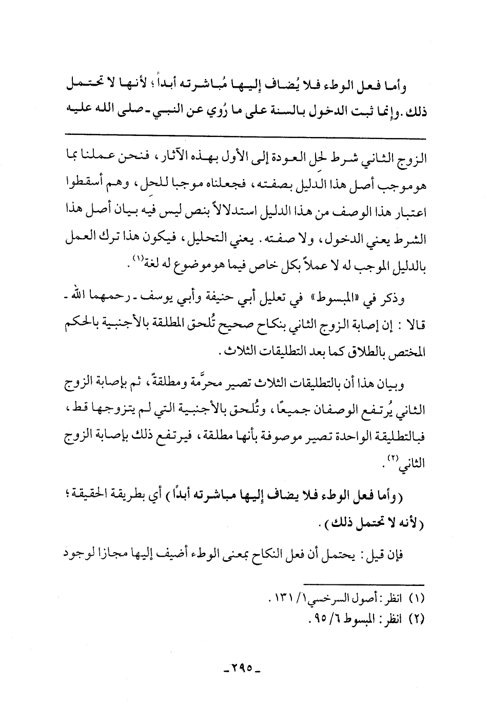 الزوج الثاني شرط لحل العودة إلى الأول بهذه الآثار، فنحن عملنا بما هو موجب أصل هذا الدليل بصفته، فجعلناه موجبًا للحل، وهم أسقطوا اعتبار هذا الوصف من هذا الدليل استدلالًا بنص ليس فيه بيان أصل هذا الشرط يعني الدخول، ولا صفته. يعنى التحليل، فيكون هذا ترك العمل بالدليل الواجب له لا عملًا بكل خاص فيما هو موضوع له لغة.