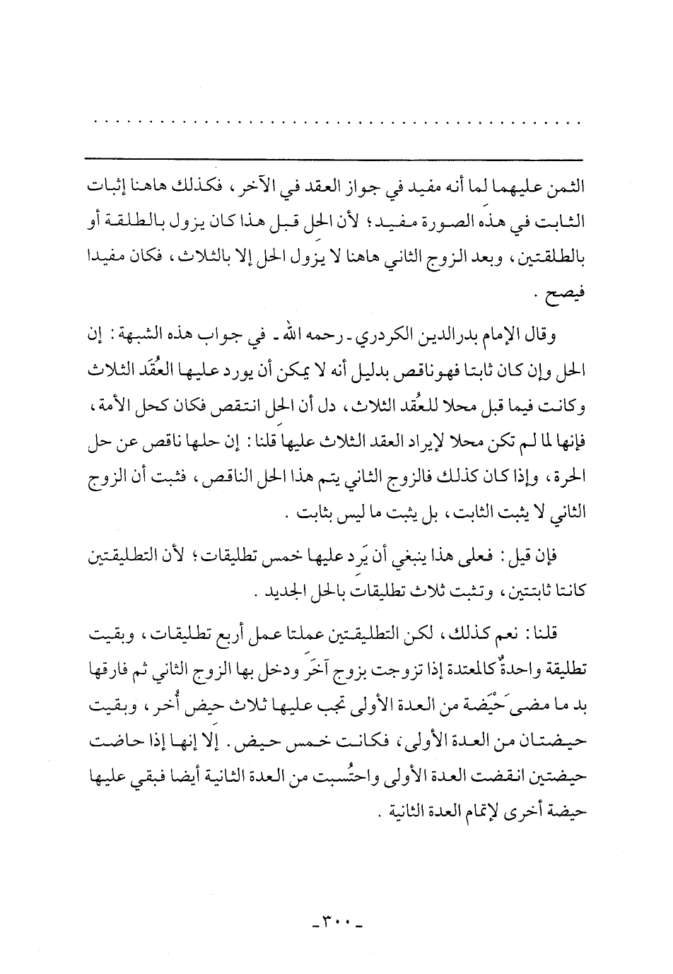 وقال الإمام بدر الدين الكردري- رحمه الله- في جواب هذه الشبهة: إن الحل وإن كان ثابتًا فهو ناقص بدليل أنه لا يمكن أن يورد عليها العقد الثلاث وكانت فيما قبل محلًا للعقد الثلاث، دل أن الحل انتقص فكان كحل الأمة، فإنها لما لم تكن محلًا لإيراد العقد الثلاث عليها قلنا: إن حلها ناقص عن حل الحرة، وإذا كان كذلك فالزوج الثاني يتم هذا الحل الناقص، فثبت أن الزوج الثاني لا يثبت الثابت، بل يثبت ما ليس بثابت.
