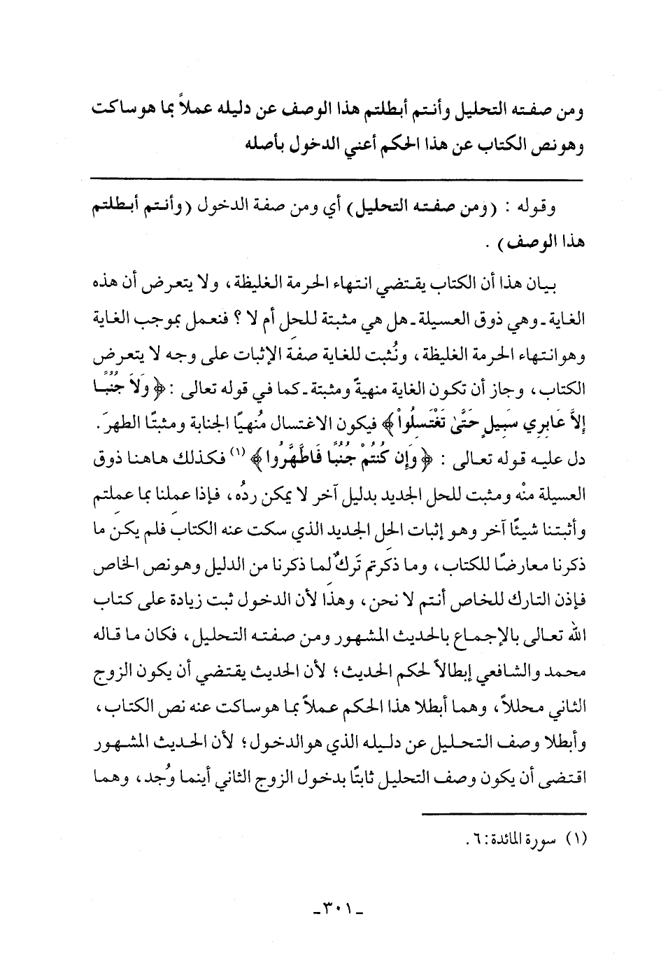 بيان هذا أن الكتاب يقتضي انتهاء الحرمة الغليظة، ولا يتعرض أن هذه الغاية- وهي ذوق العسيلة- هل هي مثبته للحل أم لا؟ فنعمل بموجب الغاية وهو انتهاء الحرمة الغليظة، ونثبت للغاية صفة الإثبات على وجه لا يتعرض الكتاب، وجاز أن تكون الغاية منهية ومثبتة- كما في قوله تعالى: {وَلا جُنُبًا إِلاَّ عَابِرِي سَبِيلٍ حَتَّى تَغْتَسِلُوا} فيكون الاغتسال منهيًا الجنابة ومثبتًا الطهر. دل عليه قوله تعالى: {وَإِنْ كُنْتُمْ جُنُبًا فَاطَّهَّرُوا} فكذلك هاهنا ذوق العسيلة منه ومثبت للحل بدليل آخر لا يمكن رده، فإذا عملنا بما عملتهم وأثبتنا شيئًا آخر وهو إثبات الحل الجديد الذي سكت عنه الكتاب فلم يكن ما ذكرنا معارضًا للكتاب، وما ذكرتم ترك لما ذكرنا من الدليل وهو نص الخاص فإذن التارك للخاص أنتم لا نحن، وهذا لأن الدخول ثبت زيادة على كتاب الله تعالى بالإجماع بالحديث المشهور ومن صفته التحليل، فكان ما قاله محمد والشافعي إبطالًا لحكم الحديث؛ لأن الحديث يقتضي أن يكون الزوج الثاني محللًا، وهما أبطلا هذا الحكم عملًا بما هو ساكت عنه نص الكتاب، وأبطلا وصف التحليل عن دليله الذي هو الدخول؛ لأن الحديث المشهور اقتضى أن يكون وصف التحليل ثابتًا بدخول الزوج الثاني أينما وجد، وهما