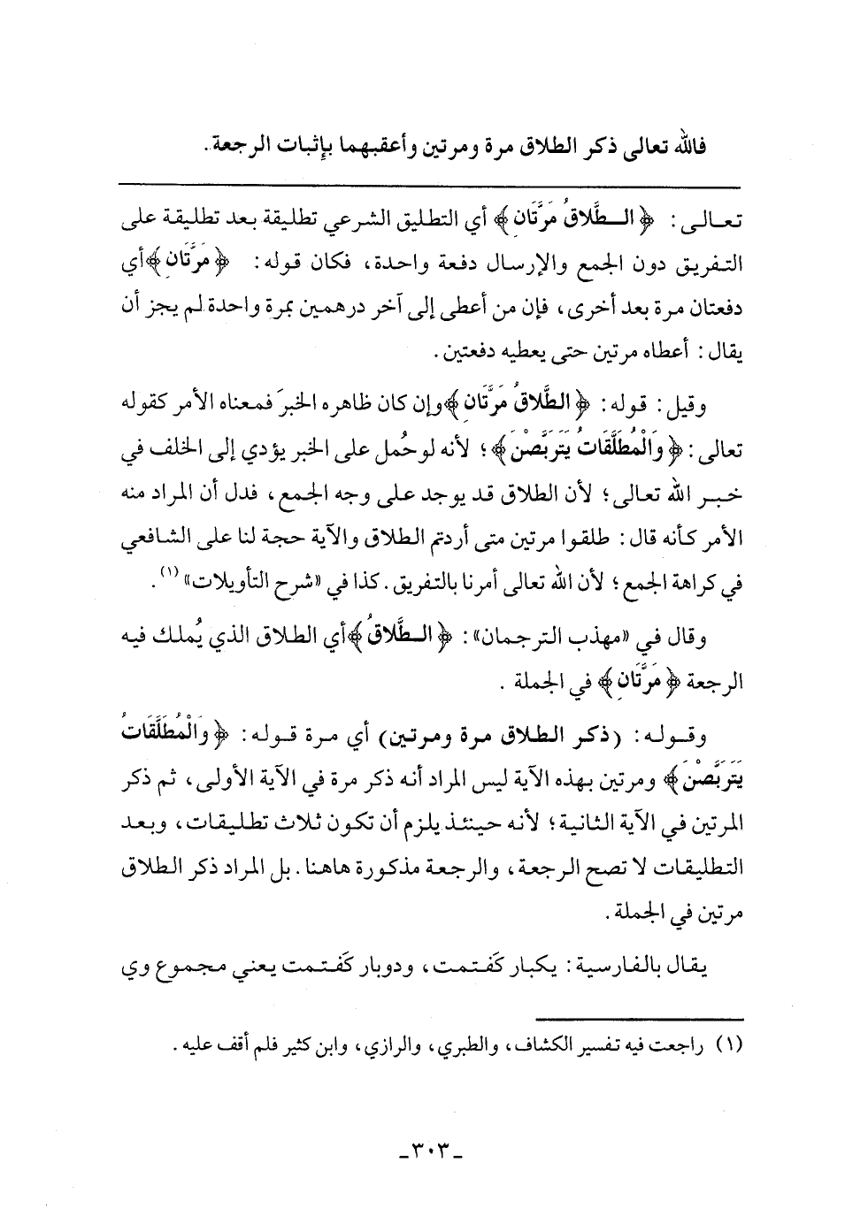 وقوله: (ذكر الطلاق مرة ومرتين) أي مرة قوله: {وَالْمُطَلَّقَاتُ يَتَرَبَّصْنَ} ومرتين بهذه الآية ليس المراد أنه ذكر مرة في الآية الأولى، ثم ذكر المرتين في الآية الثانية؛ لأنه حينئذ يلزم أن تكون ثلاث تطليقات، وبعد التطليقات لا تصح الرجعة، والرجعة مذكورة هاهنا. بل المراد ذكر الطلاق مرتين في الجملة.