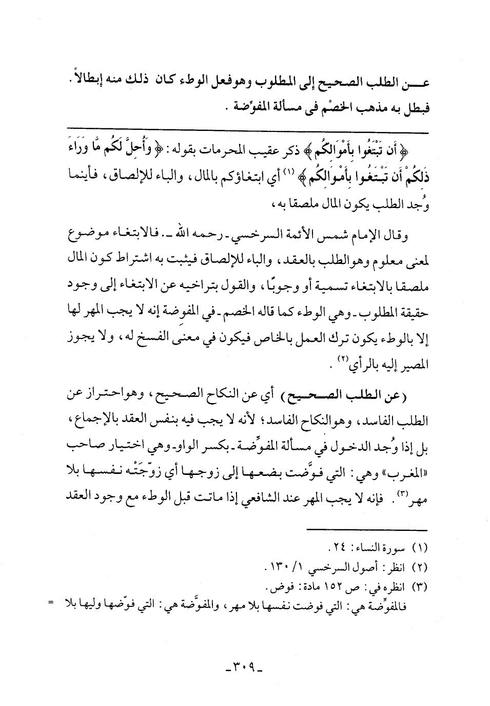 وقال الإمام شمس الأئمة السرخسي- حمه الله- فالابتغاء موضوع لمعنى معلوم وهو الطلب بالعقد، والباء للإلصاق فيثبت به اشتراط كون المال ملصقًا بالابتغاء تسمية أو وجوبًا، والقول بتراخيه عن الابتغاء ألى وجود حقيقة المطلوب- وهي الوطء كما قاله الخصم- في المفوضة إنه لا يجب المهر لها إلا بالوطء يكون ترك العمل بالخاص فيكون في معنى الفسخ له، ولا يجوز المصير إليه بالرأي.