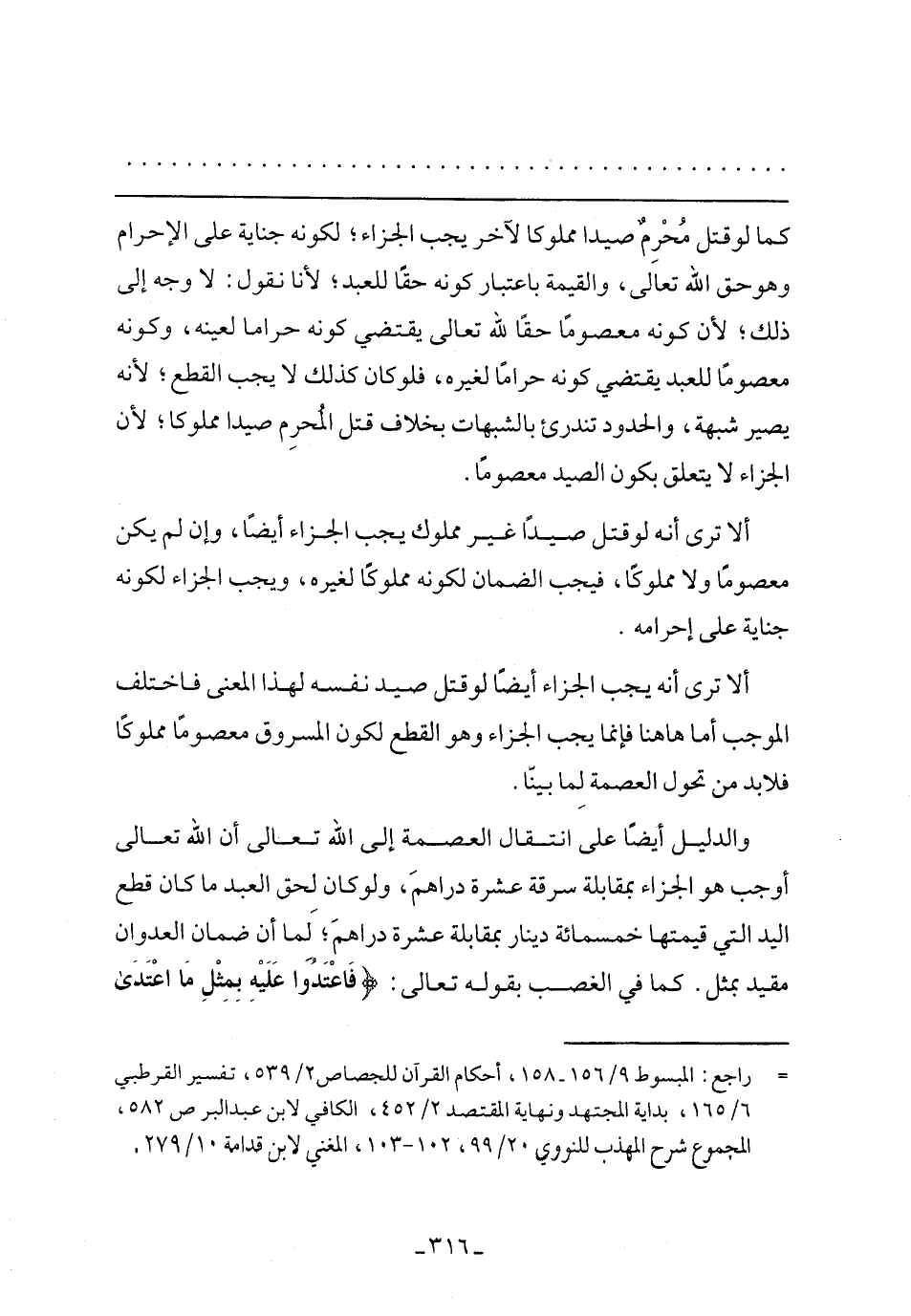 والدليل أيضًا على انتقال العصمة إلى الله تعالى أن الله تعالى أوجب هو الجزاء بمقابلة سرقة عشرة دراهم، ولو كان لحق العبد ما كان قطع اليد التي قيمتها خمسمائة دينار بمقابلة عشرة دراهم؛ لما أن ضمان العدوان مقيد بمصل. كما في الغضب بقوله تعالى: {فَاعْتَدُوا عَلَيْهِ بِمِثْلِ مَا اعْتَدَى