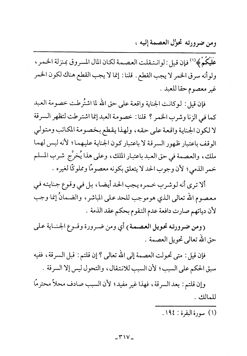 فإن قيل: متى تحولت العصمة إلى الله تعالى؟ إن قلتم: قبل السرقة، ففيه سبق الحكم على السبب؛ لأن السبب للانتقال، والتحول ليس على السرقة.