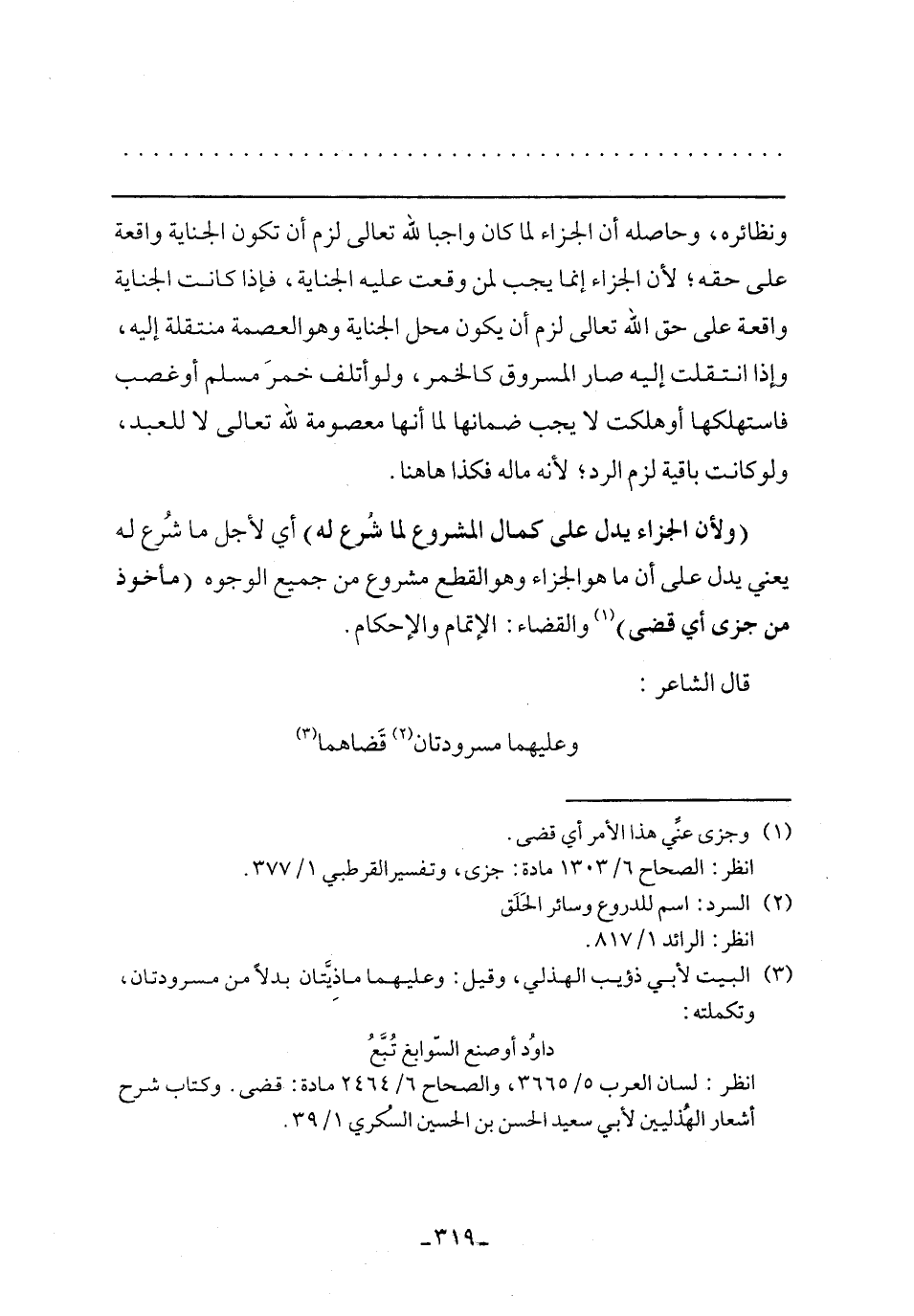 (ولأن الجزاء يدل على كمال المشروع لما شرع له) أي لأجل ما شرع له يعني يدل على أن ما هو الجزاء وهو القطع مشروع من جميع الوجوه (مأخوذ من جزي أي قضى) والقضاء: الإتمام والإحكام.