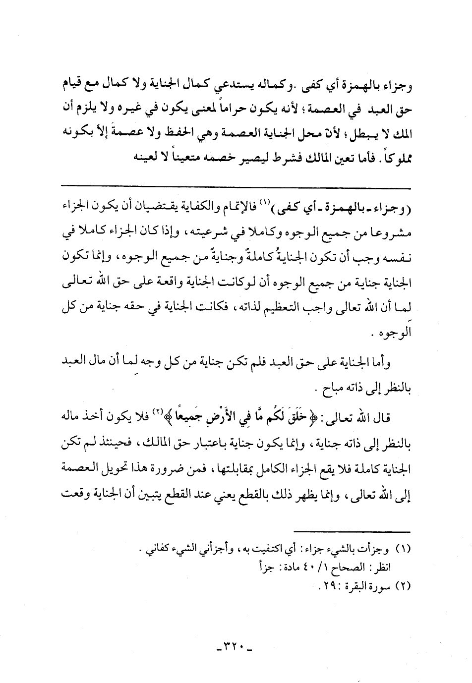 قال الله تعالى: {خَلَقَ لَكُمْ مَا فِي الأَرْضِ جَمِيعًا} فلا يكون أخذ ماله بالنظر إلى ذاته جناية، وإنما يكون جناية باعتبار حق المالك، فحينئذ لم تكن الجناية كاملة فلا يقع الجزاء الكامل بمقابلتها، فمن ضرورة هذا تحويل العصمة إلى الله تعالى، وإنما يظهر ذلك بالقطع يعني عند القطع يتبين أن الجناية وقعت